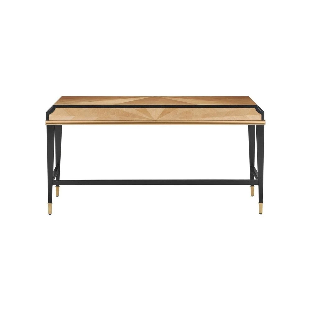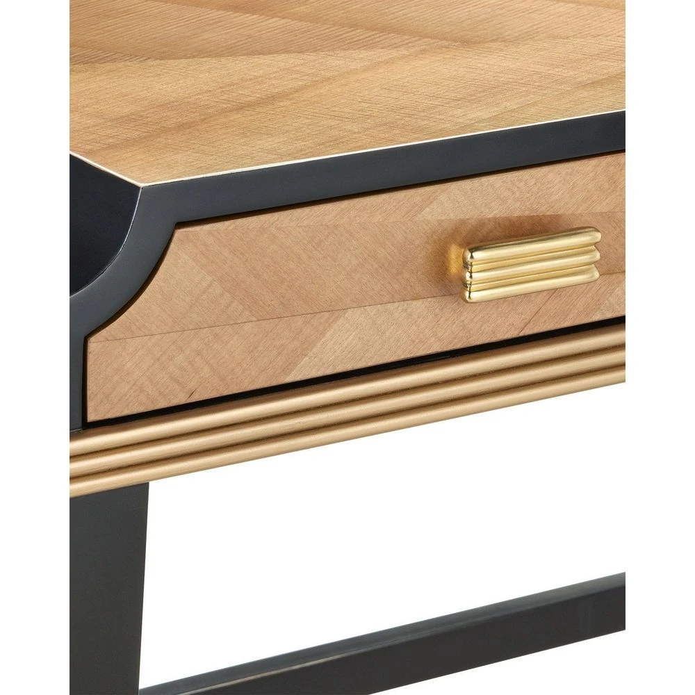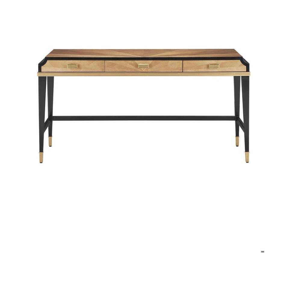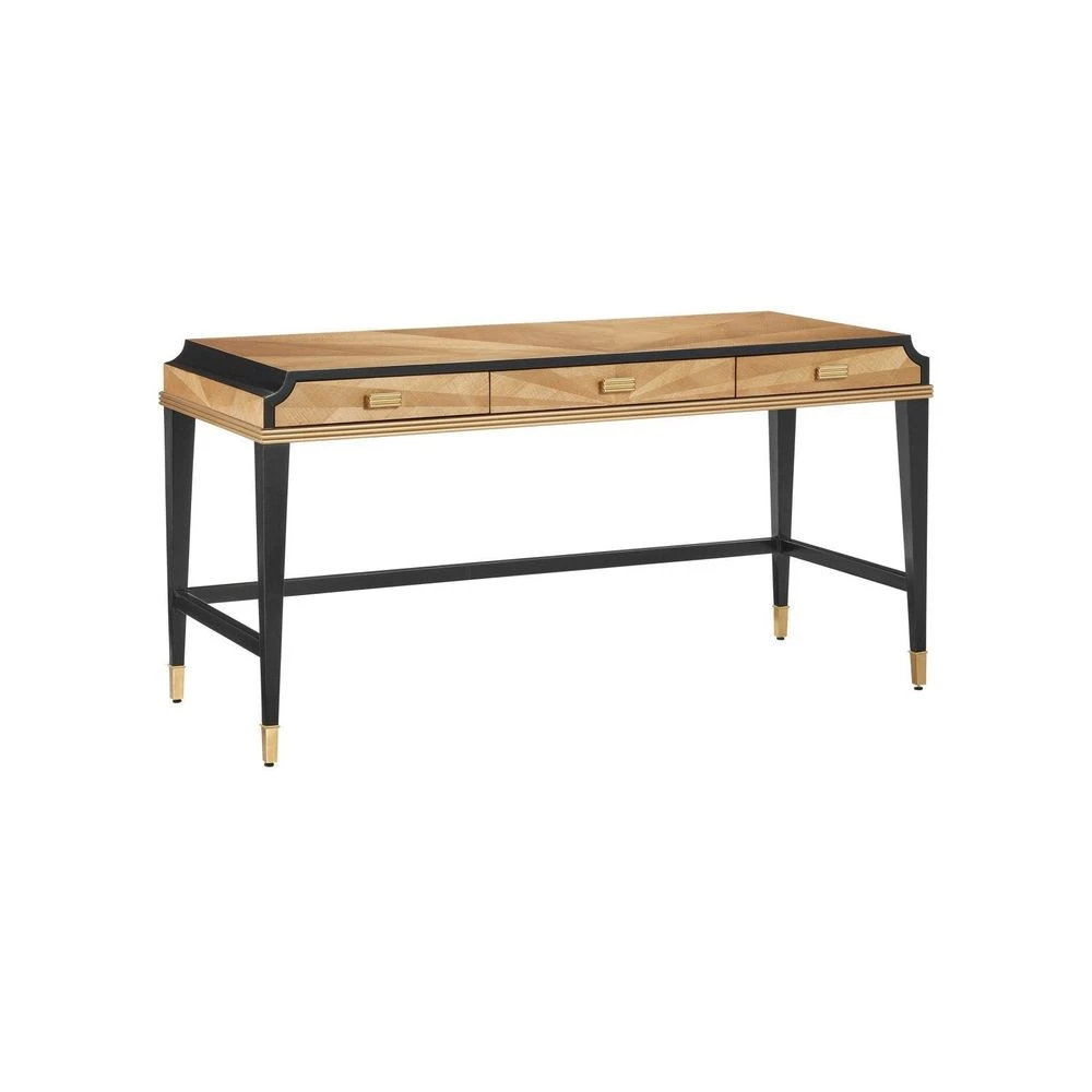 Description: The Kallista Large Taupe Desk is clad in sycamore veneers with a beautiful taupe finish that enlivens the wood grains on the top, sides, and drawers. The shape of each of the cast brass door pulls mimics the scale of the detail below the drawers. The legs and delineated details that run along the top edge of the front and sides of the desk are made of mahogany in a caviar black finish and the tailored ferrules are in a polished brass finish. Specialty treatments include wood drawer slides, a fully-finished back, and faux velvet drawer liners.