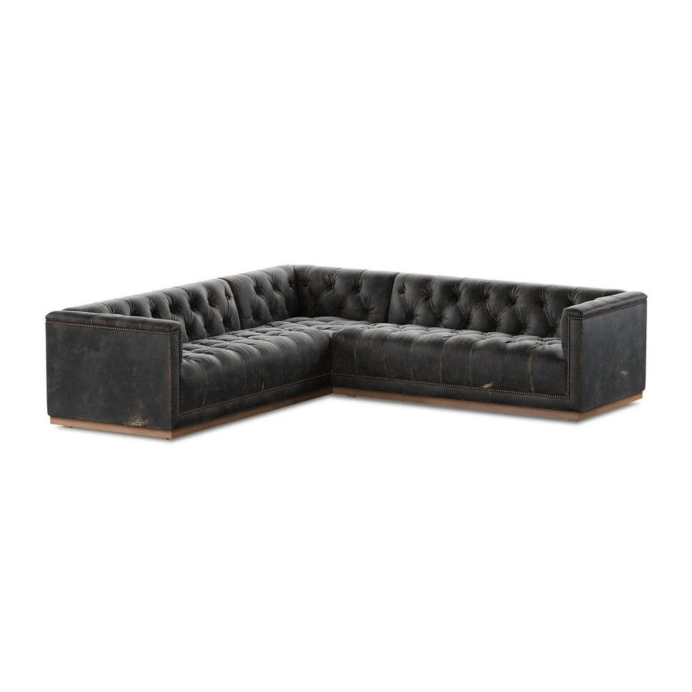 - Description: A new take on the classic library sofa with the functionality of a spacious sectional. Covered in black top-grain leather and finished with a specially designed formula that creates intentional cracking and distressing for a naturally aged look. Mounted on a weathered oak base and finished with aged bronze nailheads.