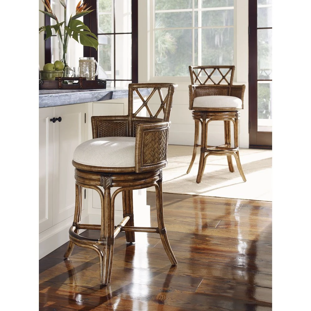 Bali Hai infuses the beauty of British West Indies styling with eclectic Polynesian influences, showcasing elements like woven raffia, rattan, crushed bamboo, penn shell inlays and leather-wrapped bamboo. Crafted in Maple and Cherry, the Caribbean Sunset finish has a warm brown patina with a soft luster, highlighted by custom hardware in an aged brass finish.