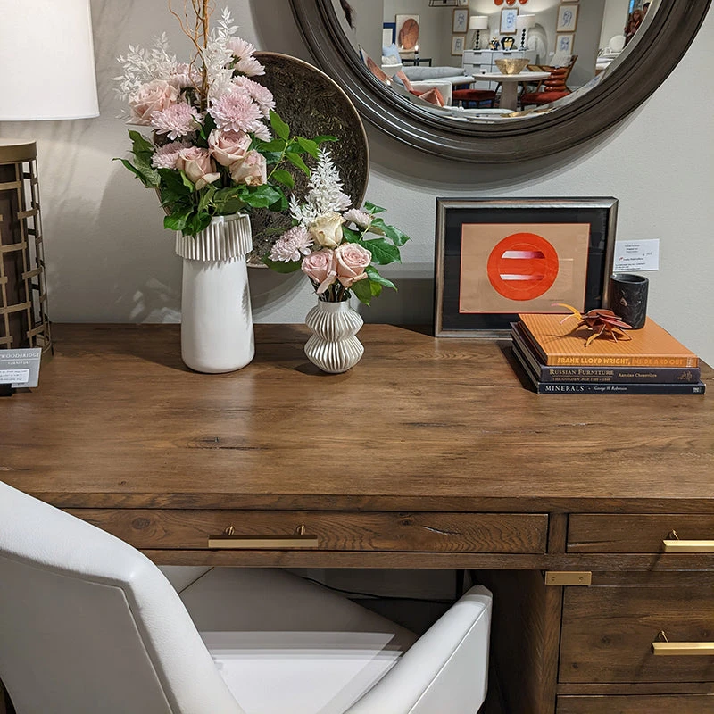 A wonderfully functional desk adapted from Japanese originals from the late 17th century. Our modernized design has authentic corner brackets called Herikanagu and a rectangular oak top over a variety of file and storage drawers mounted with brass bar pulls elevated on a metal base.
