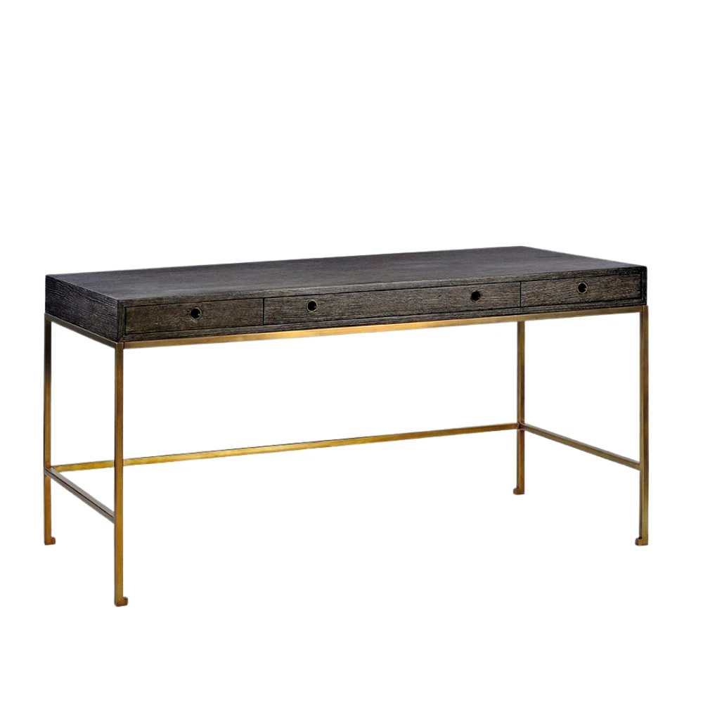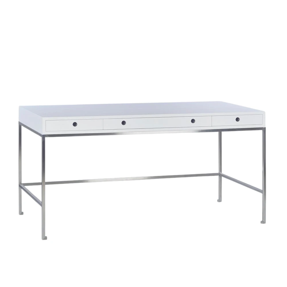Rectangle desk, three shallow drawers with metal grommet finger pulls, metal base, legs, stretcher, KD base.