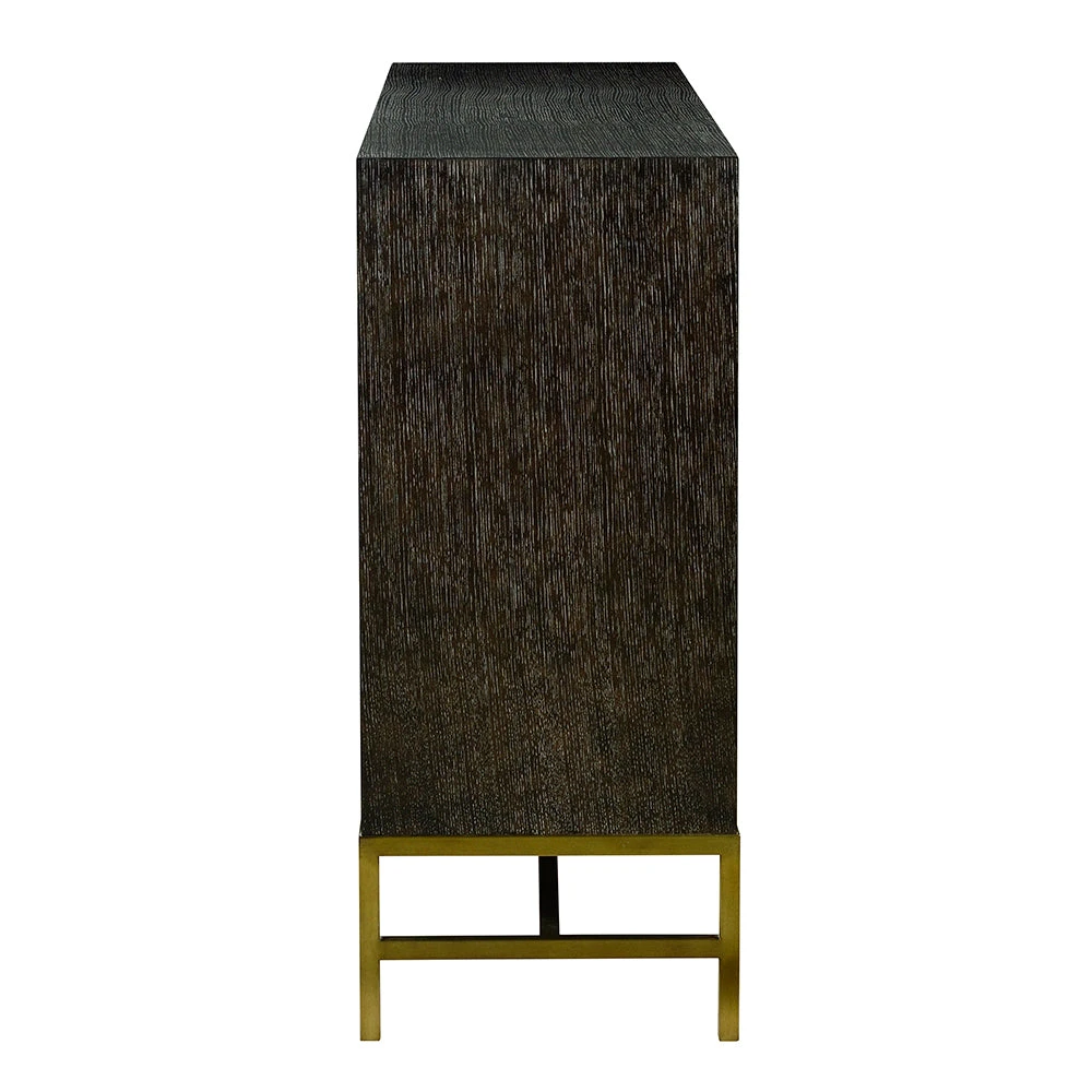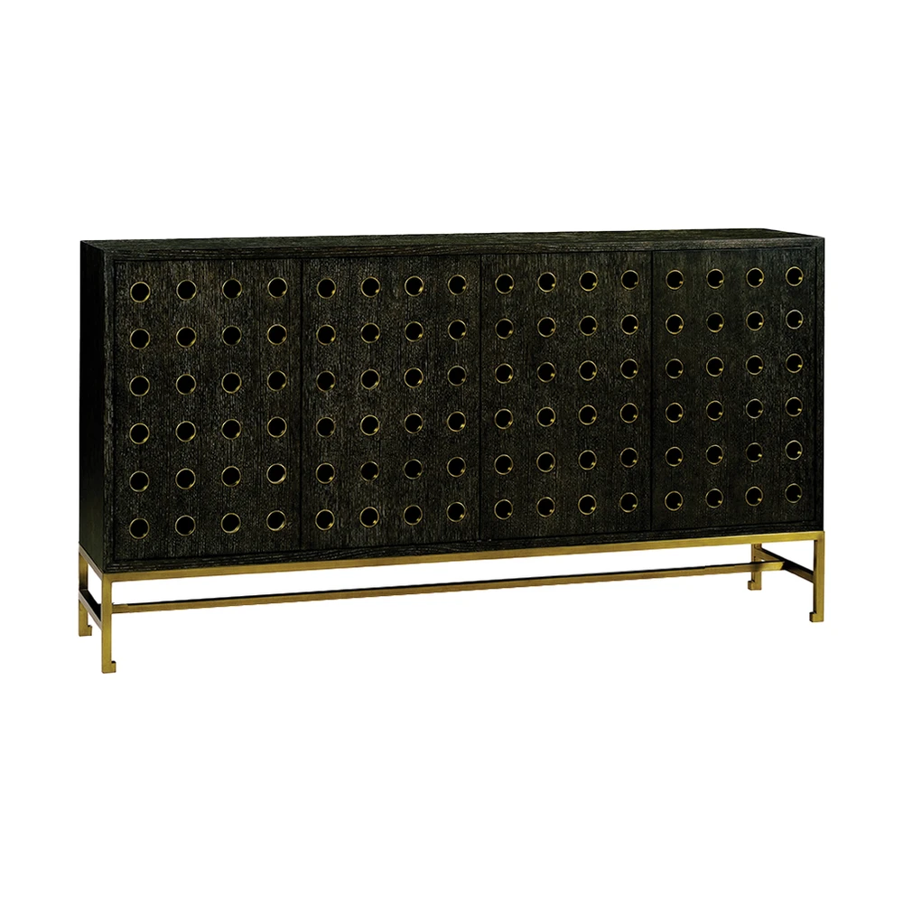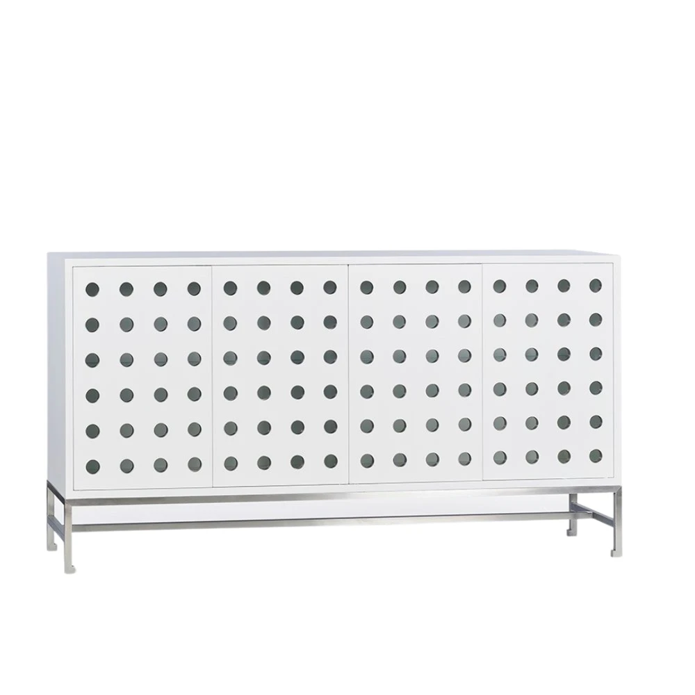 Sideboard with perforated doors, polished stainless steel details, trim, and base, interior tempered glass shelves.