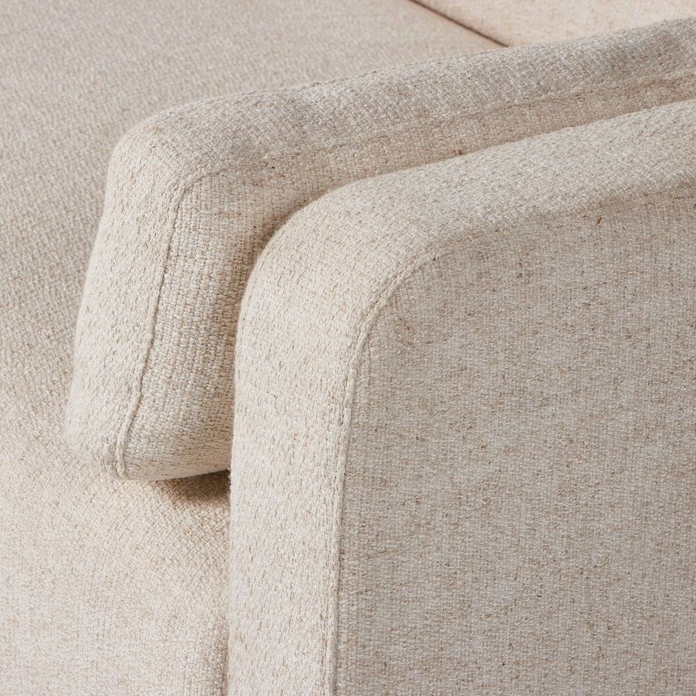 An elevated take on the modular sectional. This new collection features clean lines with loose back and arm cushions. A smooth linear base is fully upholstered and wraps up the arms for a shelter effect. Covered in a new basketweave cream fabric that brings both texture and comfort to the entire piece.