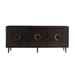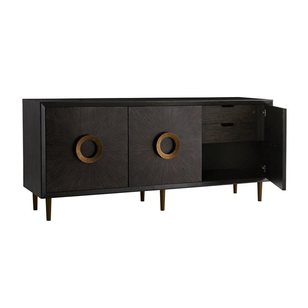 This credenza is built like your favorite antique. With so many details, it’s sure to become a treasured piece. Crafted entirely of rift-cut oak, the best quality cut of wood, it is finished in a sable-toned veneer with bold, organic wood textures. The cabinet doors have a beautiful radial-pattern detail in a brindle finish and over-sized brass pulls. Inside, you’ll find ample storage space and on the right are pull-out drawers with felt lining and cutlery inserts. Rests on four tapered, eucalyptus finished legs.