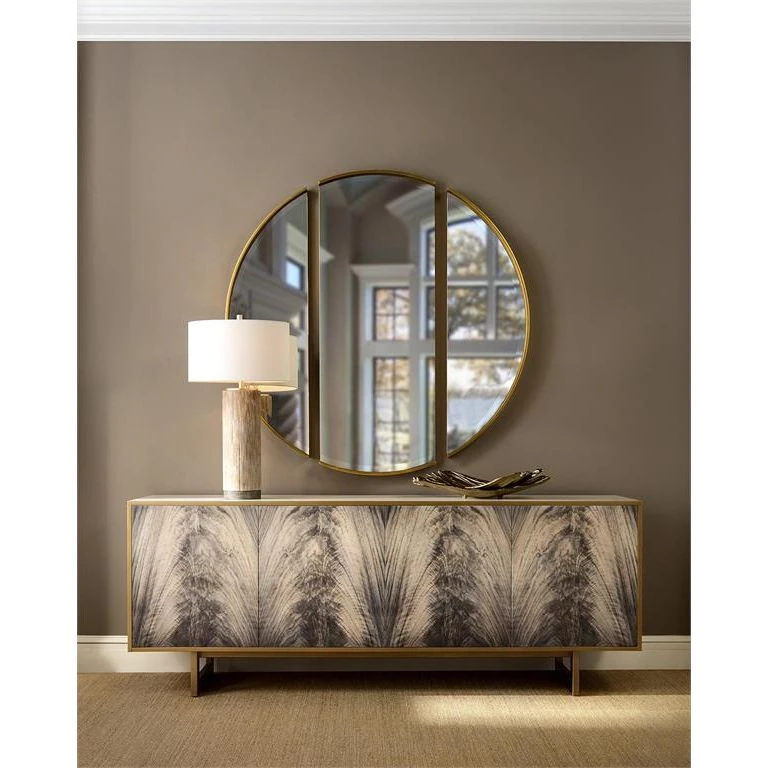 Klein’s Triptych Mirror is a stunning contemporary design with a circular shape split into three parts. The frame showcases a gorgeous Etruscan Gold finish and holds three beveled mirrors.