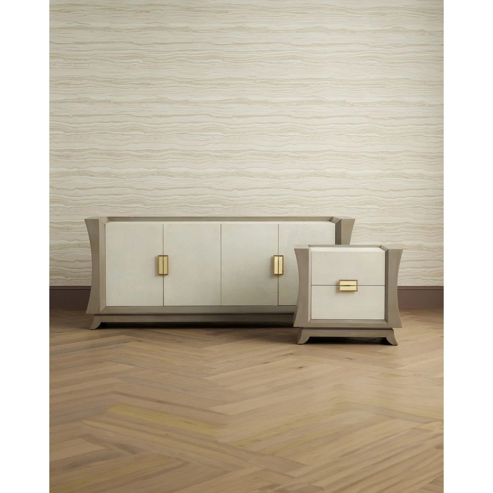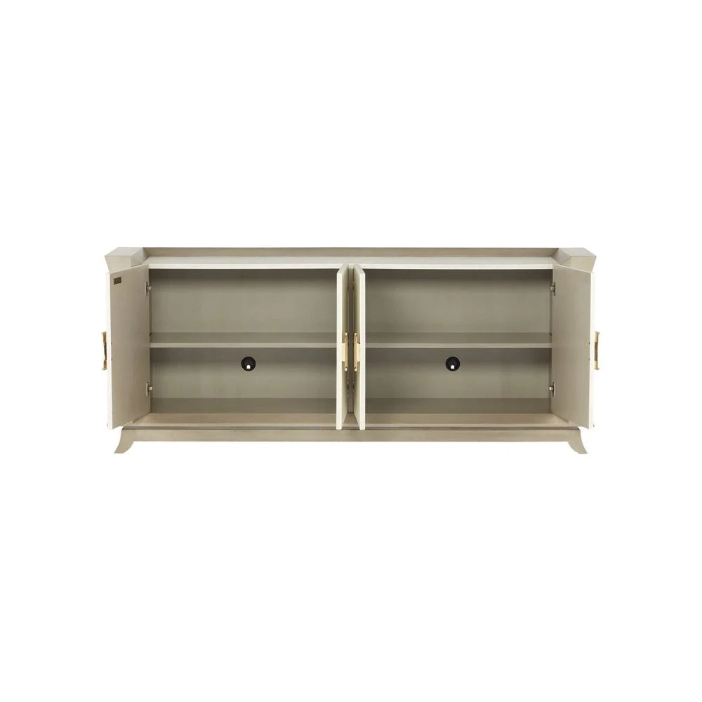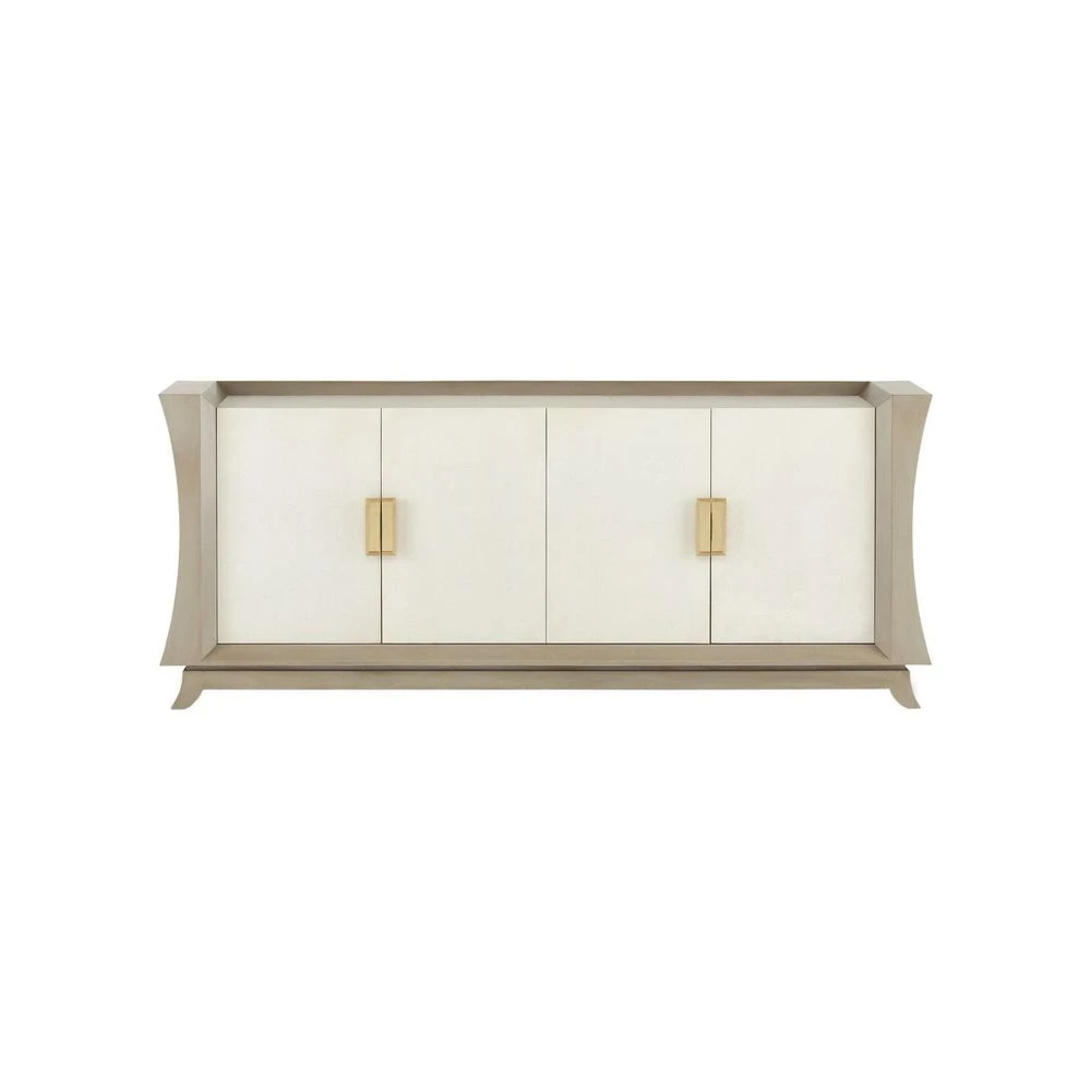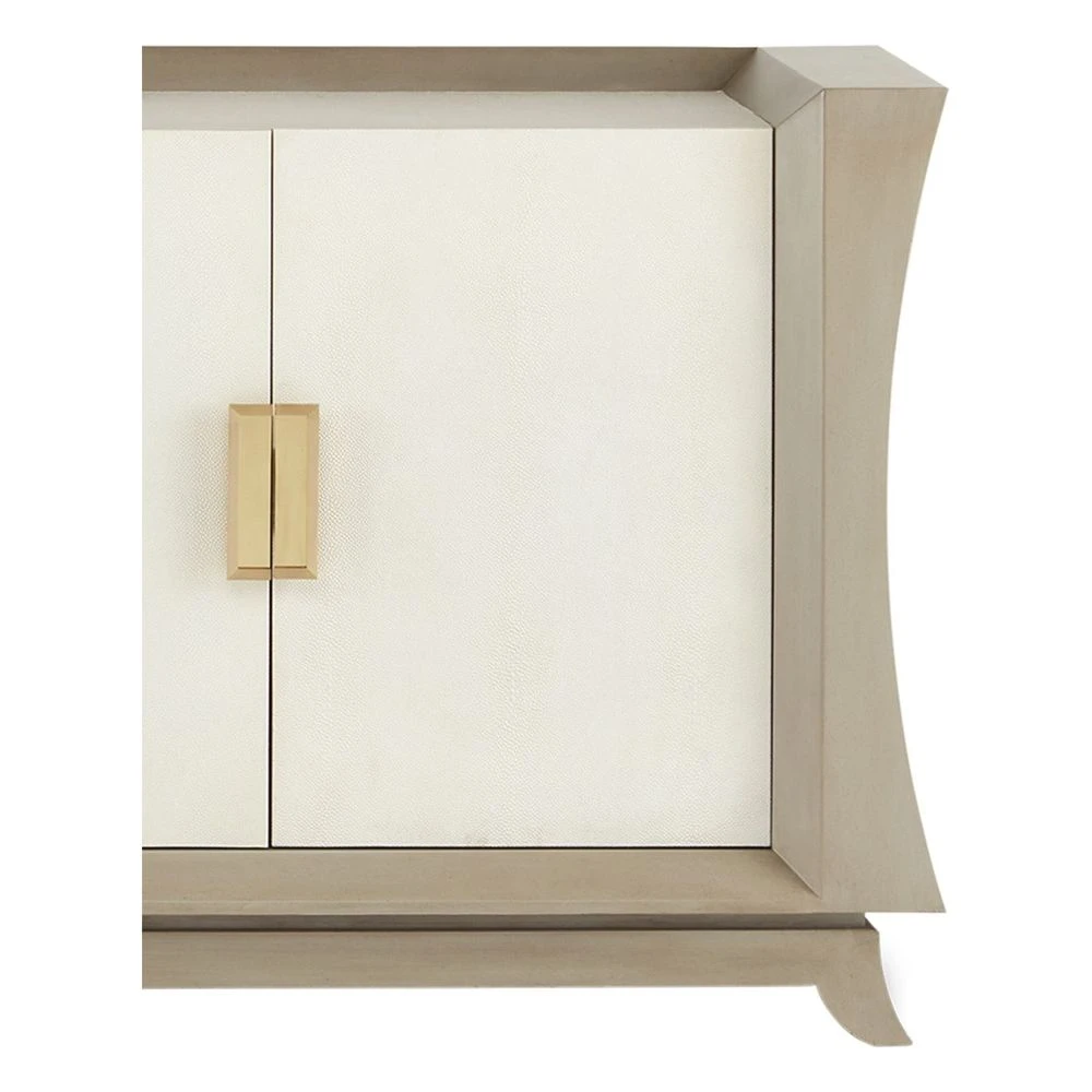 Description: The Koji Cream Credenza, designed by Barry Goralnick, has a serene presence with its curved sides and feet that emulate calligraphy shapes found in Asian characters. The doors and inset top are covered in cream faux shagreen, while the beechwood surrounding them pleasantly contrasts in an oyster gray finish. The squared-edged brass pulls have a brushed brass finish to add character to the rectilinear elements. The interior of the gray credenza is fitted with two shelves and has a pair of cable hole ports for cord management.