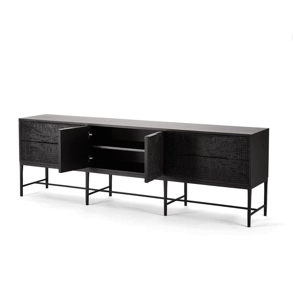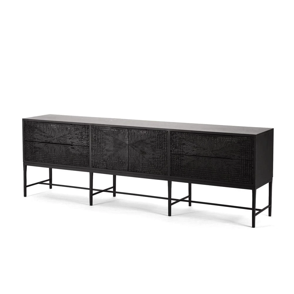 Crafted with painstaking attention to detail, the intricate carving process of the Kyoto Media Cabinet reveals the hidden beauty and texture of wood. The resulting peaks and valleys evoke an abstract, organic sculptural form, resembling delicate charcoal but without its fragility. Made from Gmelina wood, a close relative of Beechwood, the cabinet boasts a sleek matte black finish. It features four drawers and a two-door compartment with soft close slides and hidden hinges, all resting upon an elevated steel base.