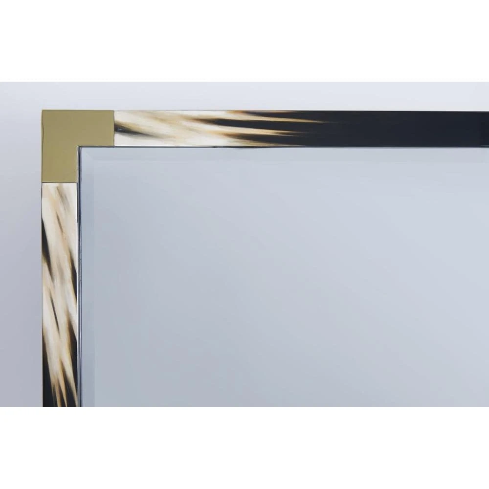 A black lacquered and faux horn mirror, the rectangular top with brass edged corners, enclosing a bevelled edge plate.
