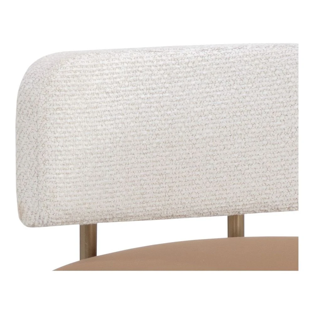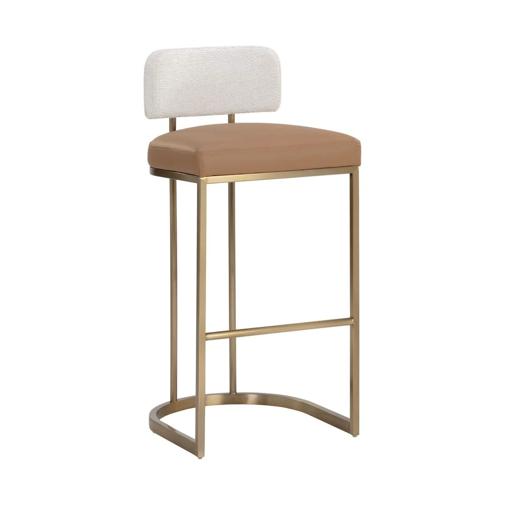 Description: The Larissa Barstool brings together a beautiful display of mixed materials. A low seatback upholstered in rhea light barley fabric contrasts the warm tones of the seat upholstered in napa cognac faux leather for an elevated aesthetic. The antique brass stainless steel frame features a handle on the back for a functional and stylish addition. Handle With Care: This design has been crafted with faux leather. Faux leather is manufactured to reflect the natural characteristics of leather; as such, colour variations, markings, wrinkles, grooves, and light scratches are appreciated characteristics. No two pieces will be alike. Visit our Product Care page for more information on how to ensure the lasting beauty of this piece.