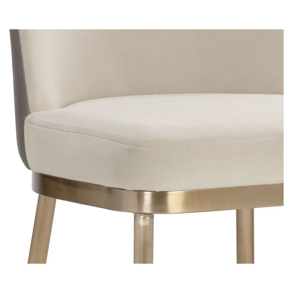 Description: The minimalist frame of the Lavania Barstool is brought to life with an exquisite combination of two toned fabrics. Expertly upholstered with soft meg taupe fabric on the seat and interior while textured porcini taupe faux leather adds a tactile touch to the back exterior. The design is complemented with powder-coated antique brass stainless steel. Handle With Care: This design has been crafted with faux leather. Faux leather is manufactured to reflect the natural characteristics of leather; as such, colour variations, markings, wrinkles, grooves, and light scratches are appreciated characteristics. No two pieces will be alike. Visit our Product Care page for more information on how to ensure the lasting beauty of this piece.
