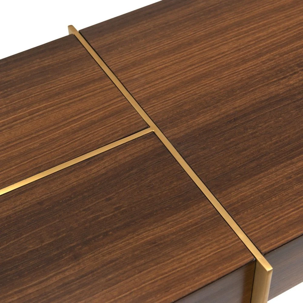 Description: Beautifully crafted from figured eucalyptus wood in a Light Smoke finish, the Leif Console Table demonstrates a sophisticated, eloquent color palette that marries transitional charm with contemporary design. Showcasing sharp angles and steep curvature, the stainless steel base is adorned in a brushed brass finish, providing gorgeous contrast to the deep brown shade and straight grain of the rounded wooden surface.
