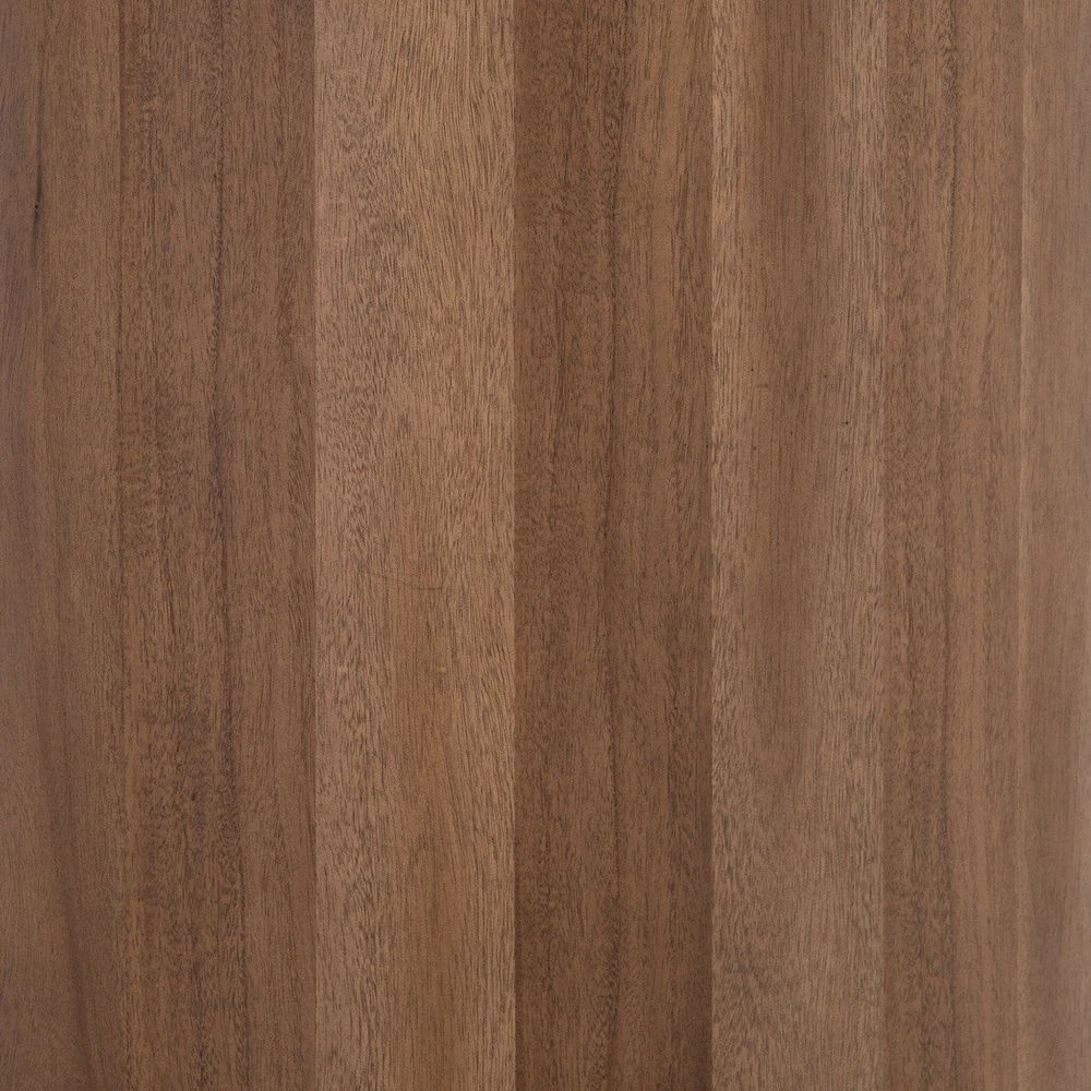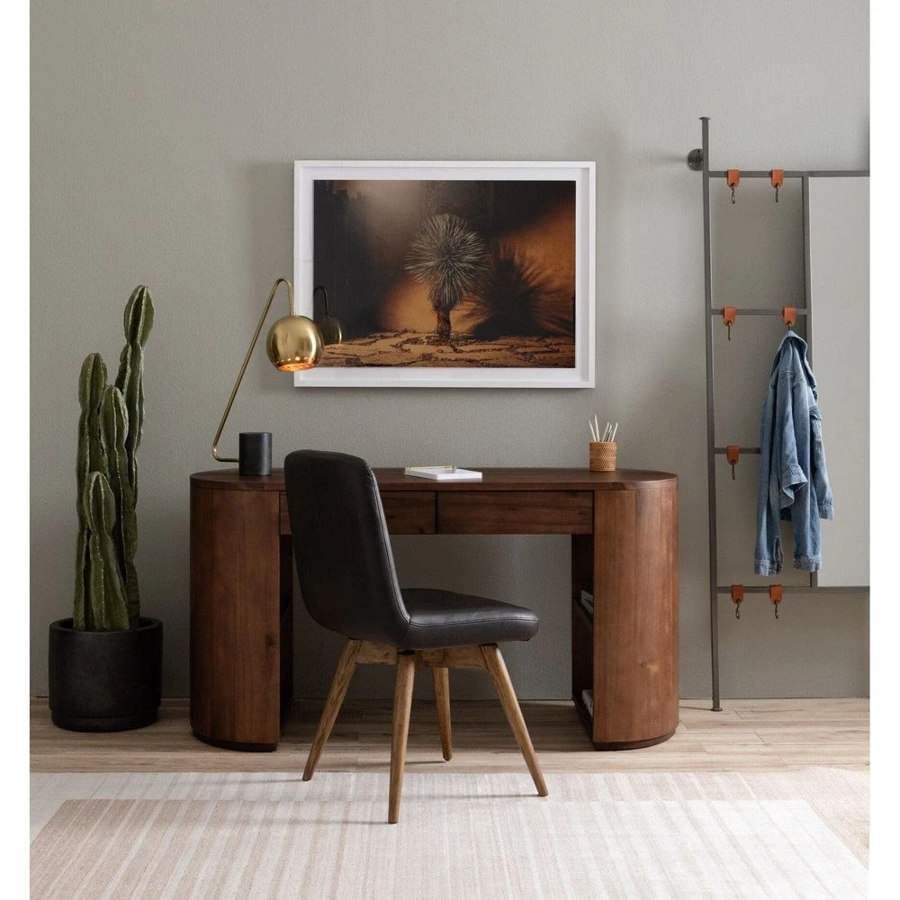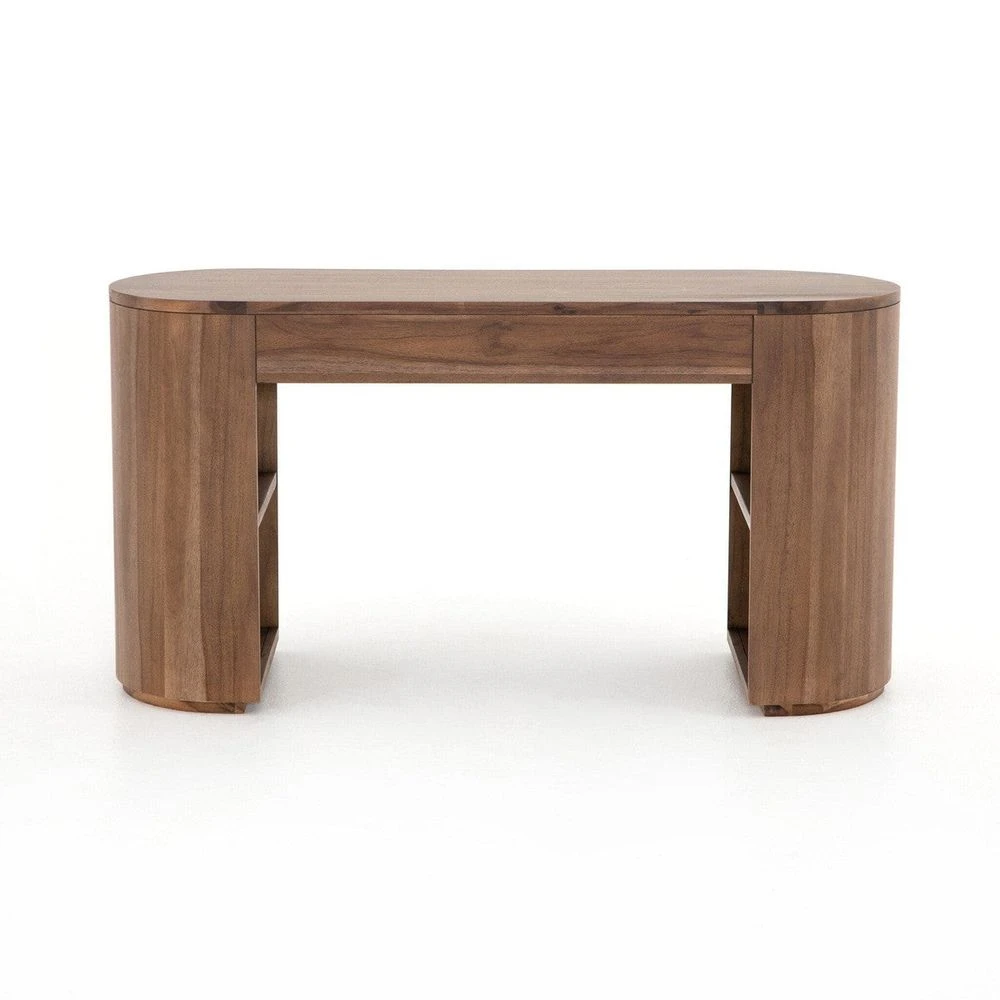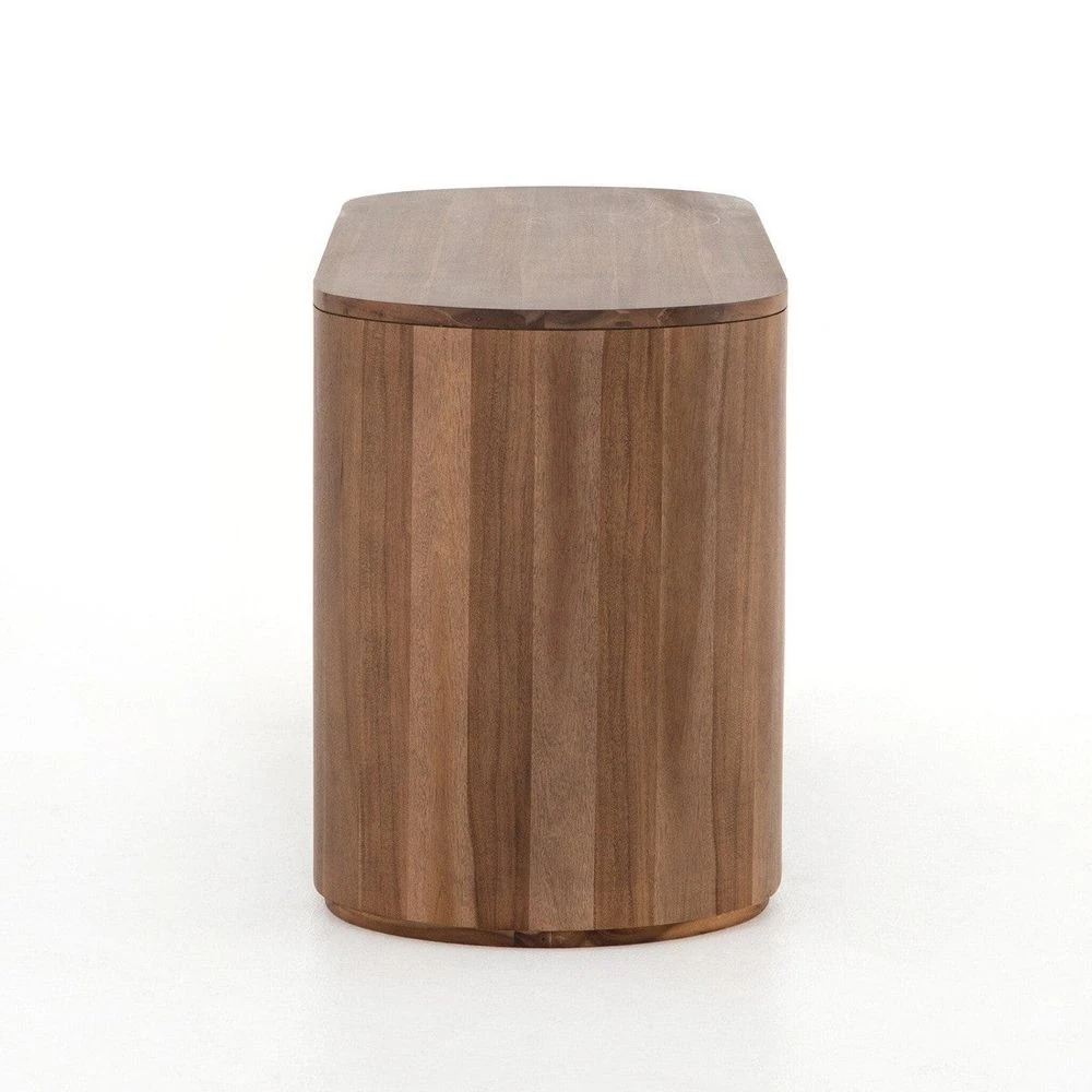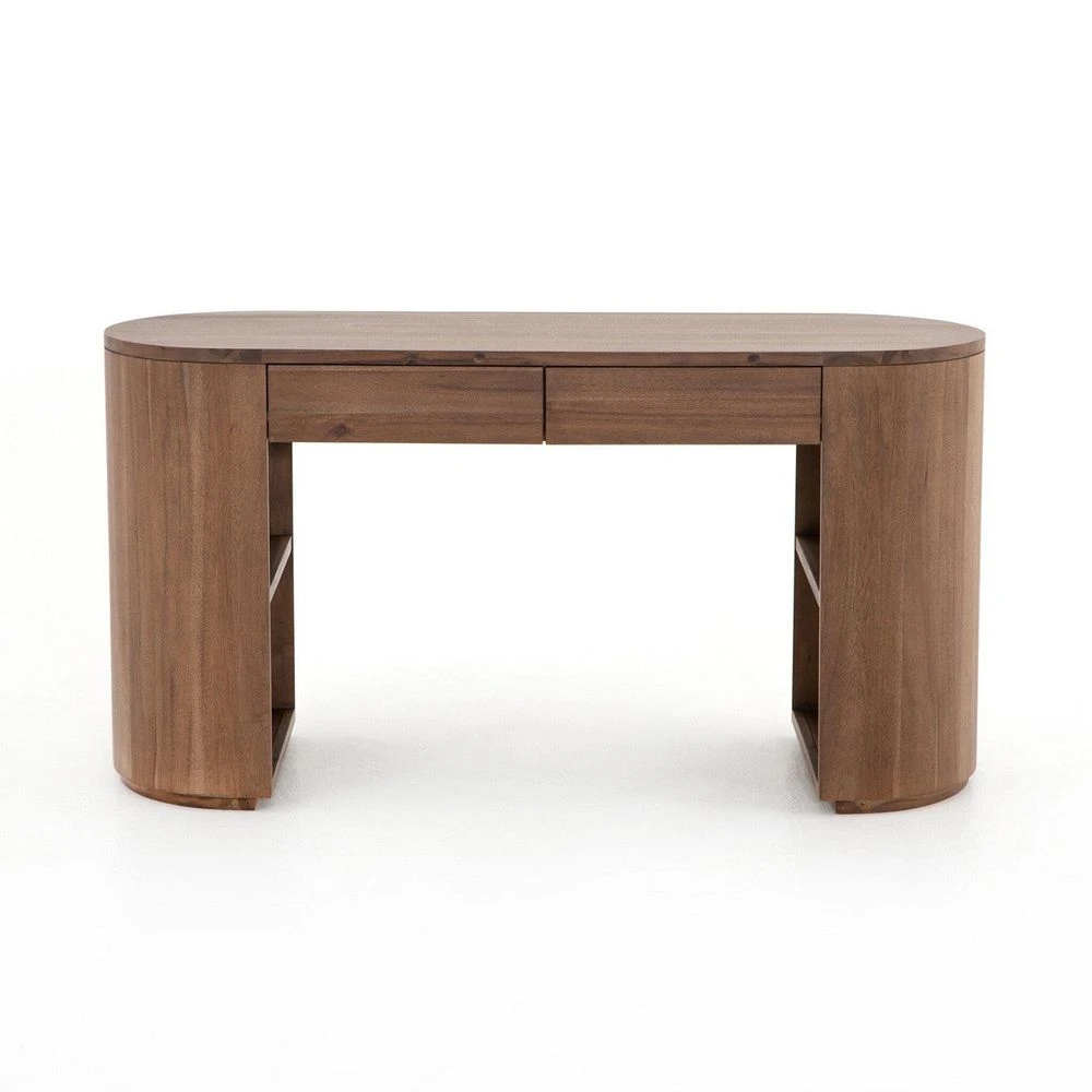 - Description: Finished in a rich caramel brown, acacia forms a pill-inspired shape to nod Eighties-era design. Half-cylinder bases feature open interior shelving, with two top pencil drawers to keep supplies handy.