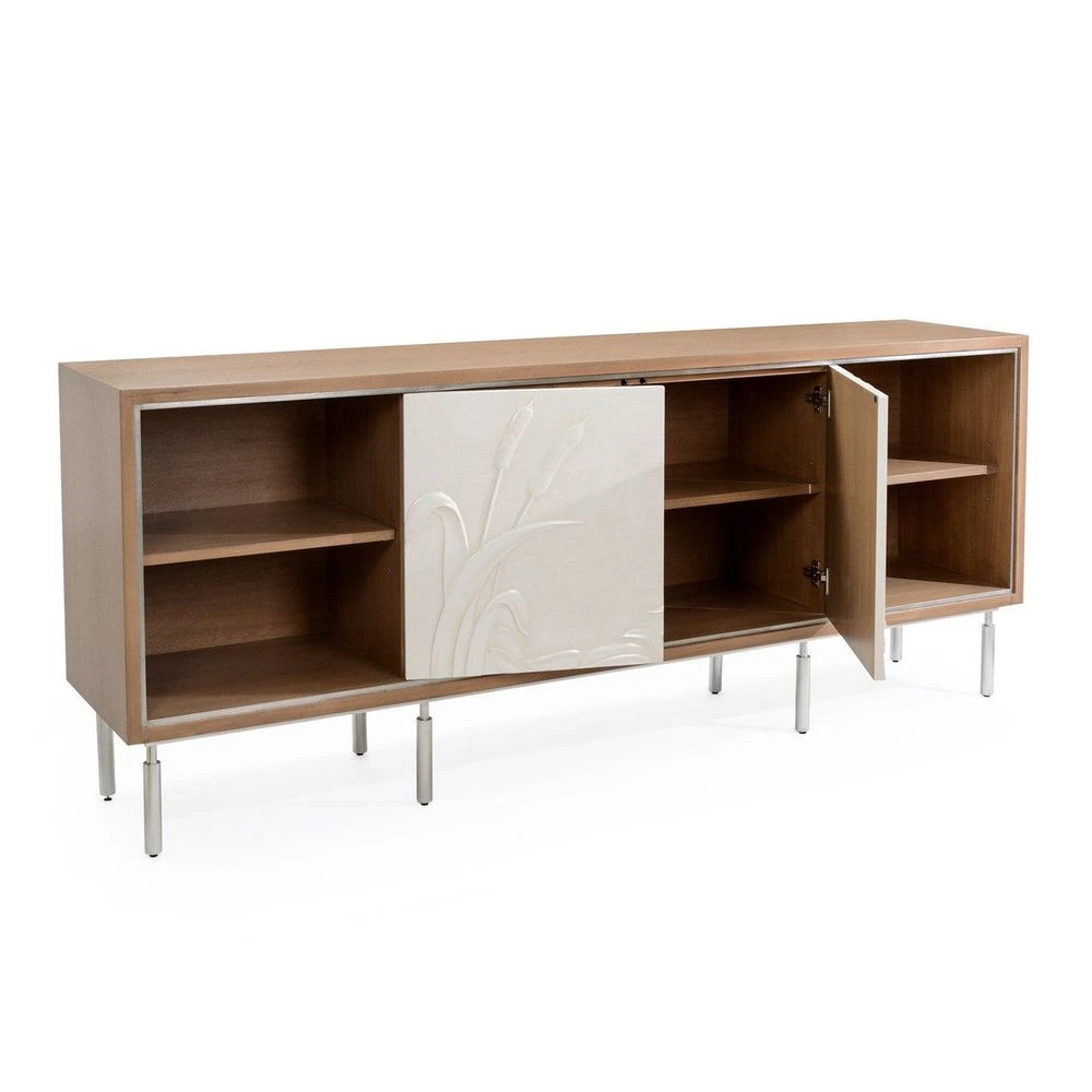 Description: The Leif Sideboard features a timeless rectangular design with a breezy coastal motif. The robust walnut frame in a Suede finish is beautifully contrasted by two off-white doors in Opal Linen featuring cattail plants and a remarkably detailed pelican. A metallic trim in Pewter outlines the frame, with several matching cylindrical legs spread across the bottom to give the Leif a touch of modern flair.