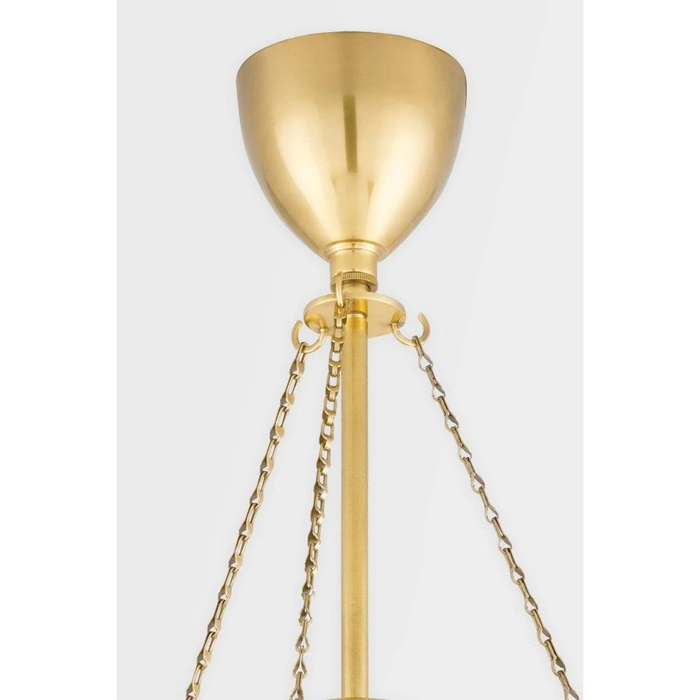 Large in scale and thoughtfully designed, Levette is statement lighting at its absolute finest. An eye-catching, shiny dome shade in real aged brass or aged silver is held aloft by a handmade Jack chain that hooks to a slender stem. The accent piece at the top of the shade adds an unexpected flair and coordinates beautifully with the cone-shaped canopy.