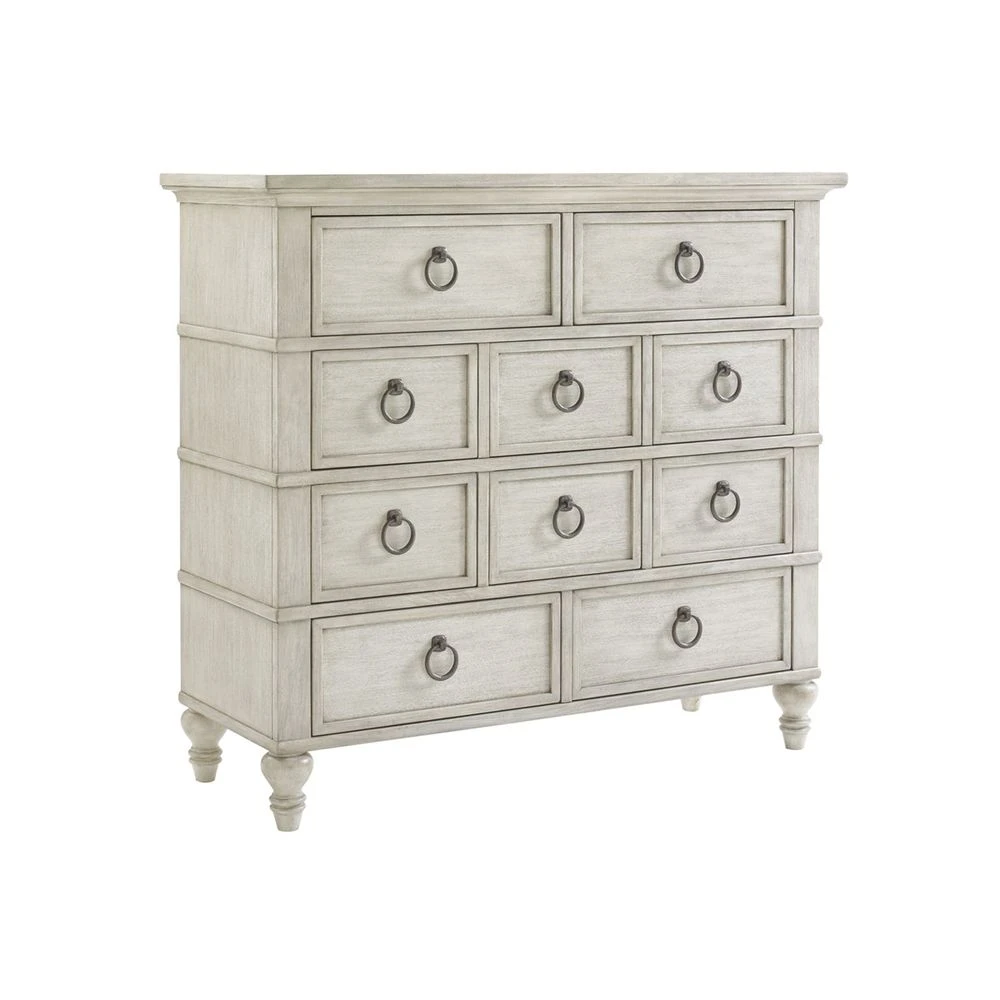Pulling the look together is a sophisticated oyster finish over the graceful lines of cathedral mahogany, lightly distressed, with custom hardware in an antique pewter finish. Getting away will always have its place, but nothing feels as good as returning to the comforts of home.
