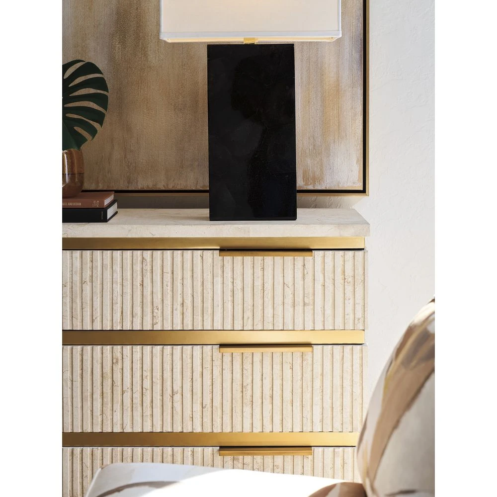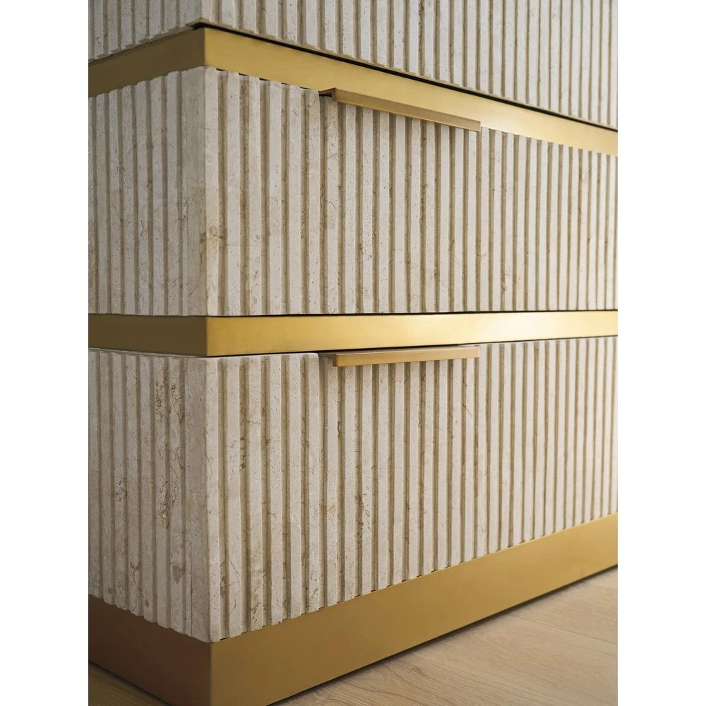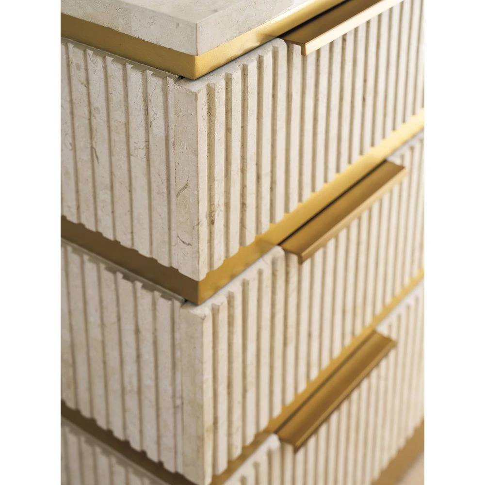 Marketing Copy: Offering a fresh take on casual contemporary living, La Costa features elegant curves, fluted detailing, and a fusion of materials like Anticato marble, honed limestone and metal accents in a satin gold finish. Designs incorporate touches of Mid-Century styling for a sophisticated yet approachable interpretation of luxury living.