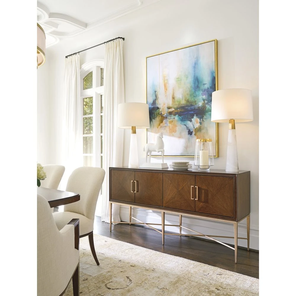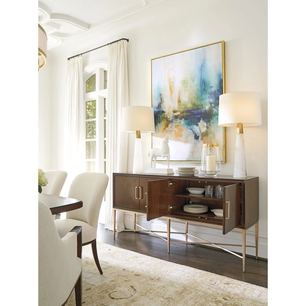 Marketing Copy: Designs in Rendezvous are best described as modern classics, or the place where contemporary meets traditional. Crafted from walnut veneers with elegant cathedral grain patterns, pieces are finished in a rich sable brown finish. Hardware is finished in rose gold and metal accents feature gold-burnished silver leaf. Select items showcase the natural beauty of Bulgari Beige marble tops. The result is a classic take on modern design, and a fresh view of luxury living.