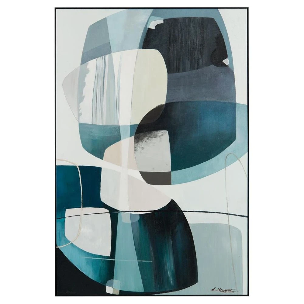 LM Zhou’s geometric abstract brings a modernistic style with the calming blue and grey color palette. This hand-painted art is framed in a black gallery molding.