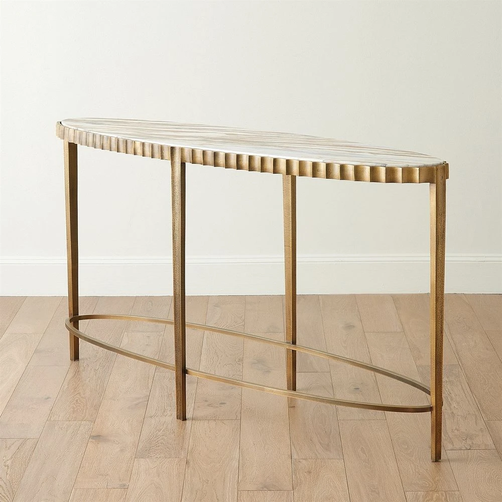 Description: The Liberty Console features a luxurious Calacatta Gold marble surface and a fluted brass design with a vintage brass finish. This stylish console adds sophistication to any entryway or living space. Each piece of Calacatta Gold marble has beautiful, distinct veining and coloring, making every item one-of-a-kind.