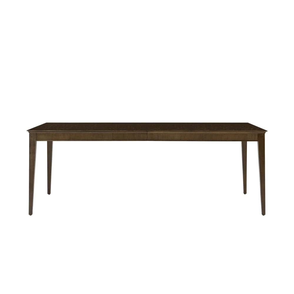 The Lido Rectangular Dining Table, crafted in a Prima Vera in our dark Bistre finish, features a reeded apron set upon sleek tapered legs. Includes two leaf inserts and two additional legs for a more luxurious dining experience.