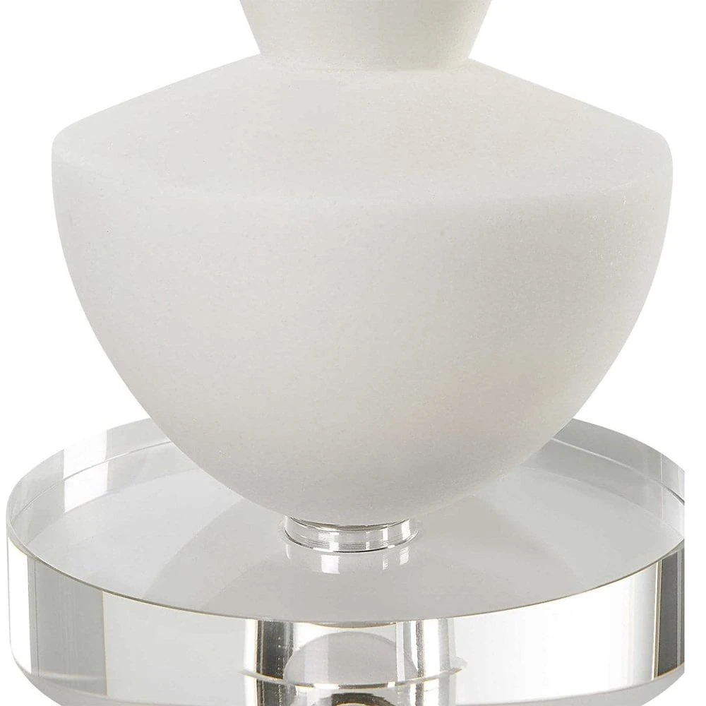 Sculptural candle holders crafted from ivory man-made stone that accurately replicates the look of Thassos marble and is accented by an elegant crystal foot. Includes two, 3×3 distressed white candles. Sizes: S-5x12x5, L-5x16x5
