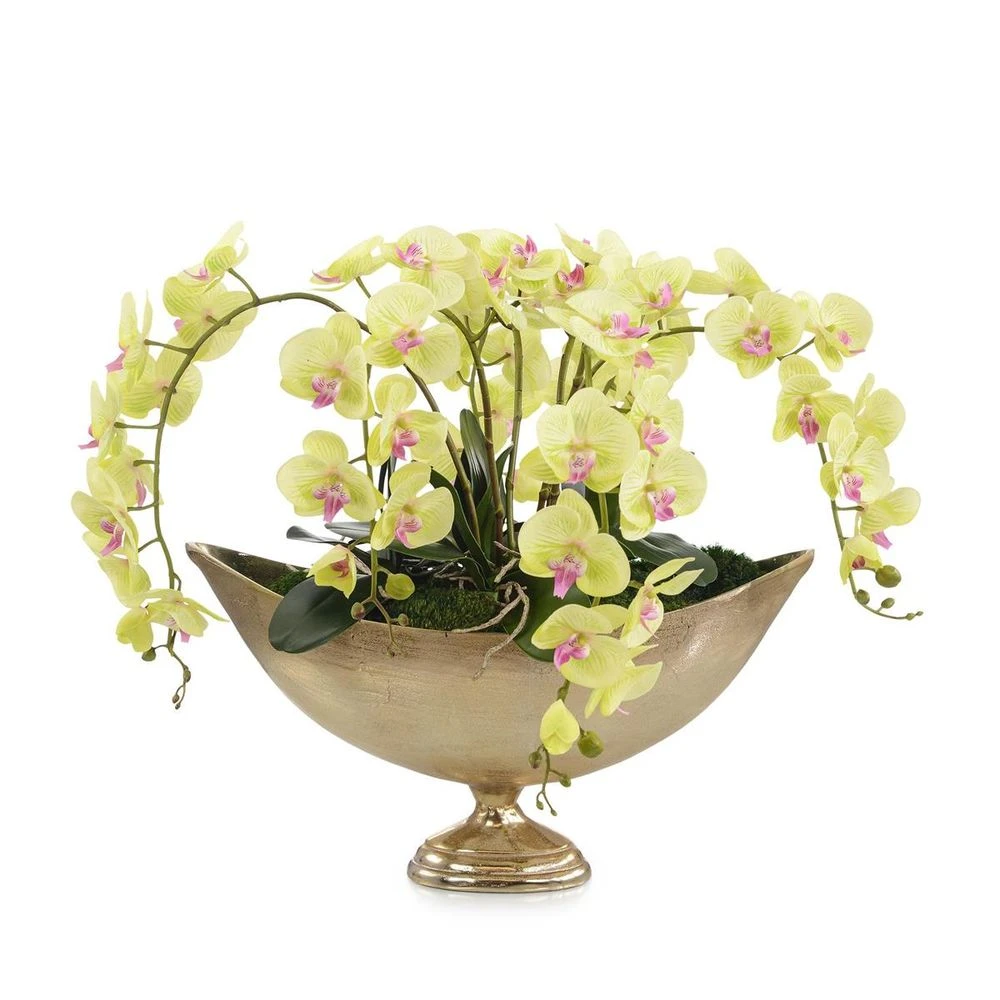Description: Lime green phalaenopsis orchid garden in a large golden pedestal urn with natural preserved mood moss.