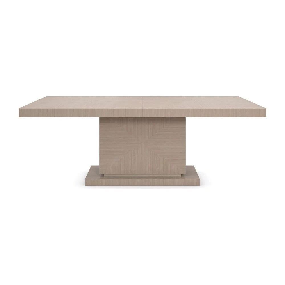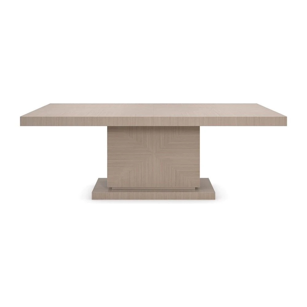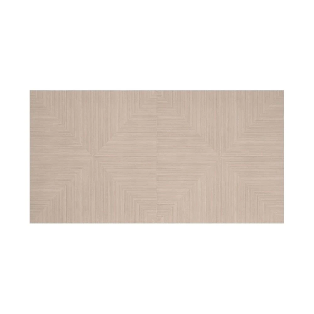 Inspired by classical architecture, this dining table introduces a minimalist form with a strikingly balanced design aesthetic. A tonal Woodland Gray finish naturally highlights the exquisite linear wood grains of Japanese Sen Veneers, offset by a slim horizontal reveal in Sparkling Argent to accent its monolithic base. An expansive tabletop extends to 105″ with a self-storing butterfly leaf to easily accommodate up to 10 guests.