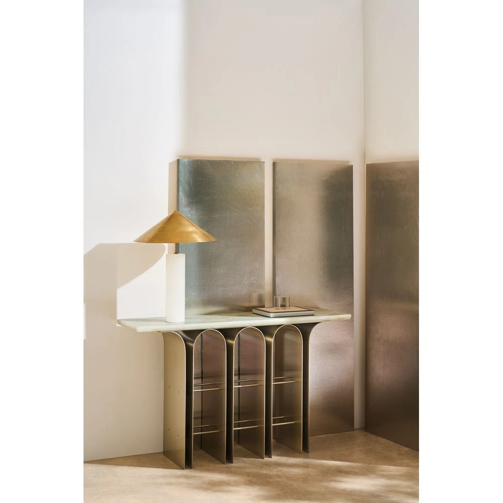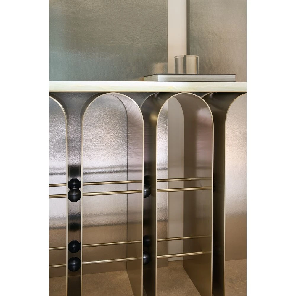 Reminiscent of the modern arcade bridge in the mountains outside the town of Eze, France, the Nexus Console Table is sleek and statuesque Äì the perfect m√É©lange of nature and architectural form. Its colorfully rich Green Onyx Marble top sits on a series of tall Brushed Deep Bronze metal arches separated by Brushed Gold ball accents.
