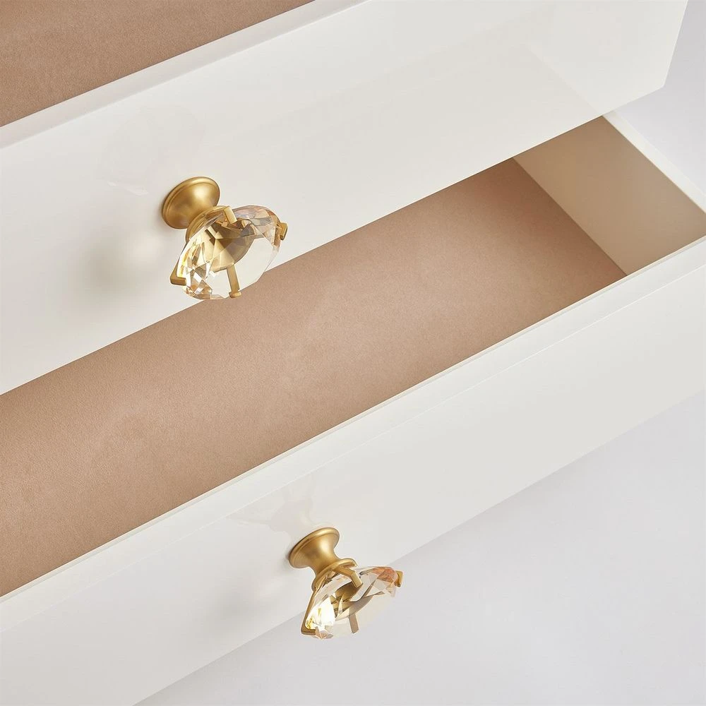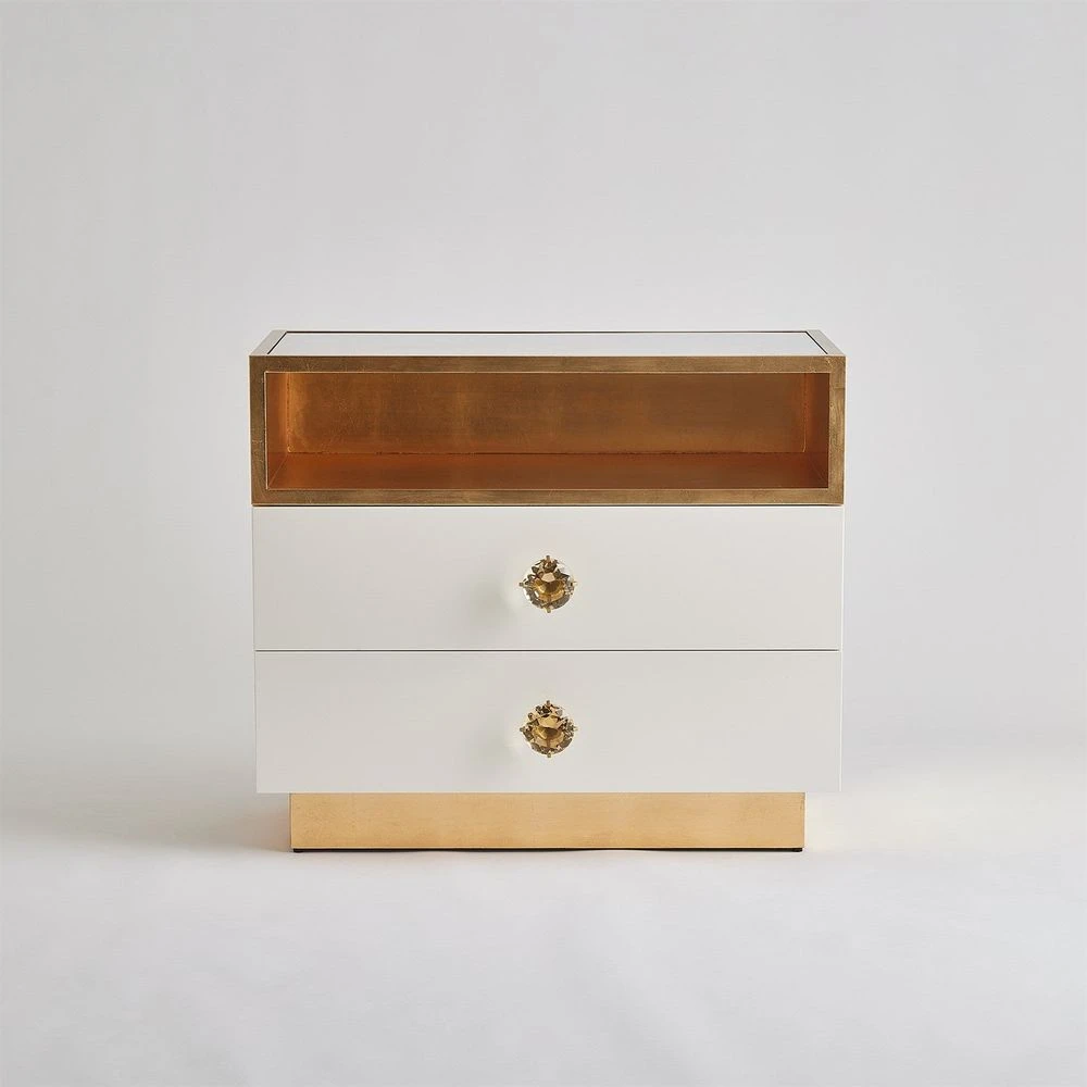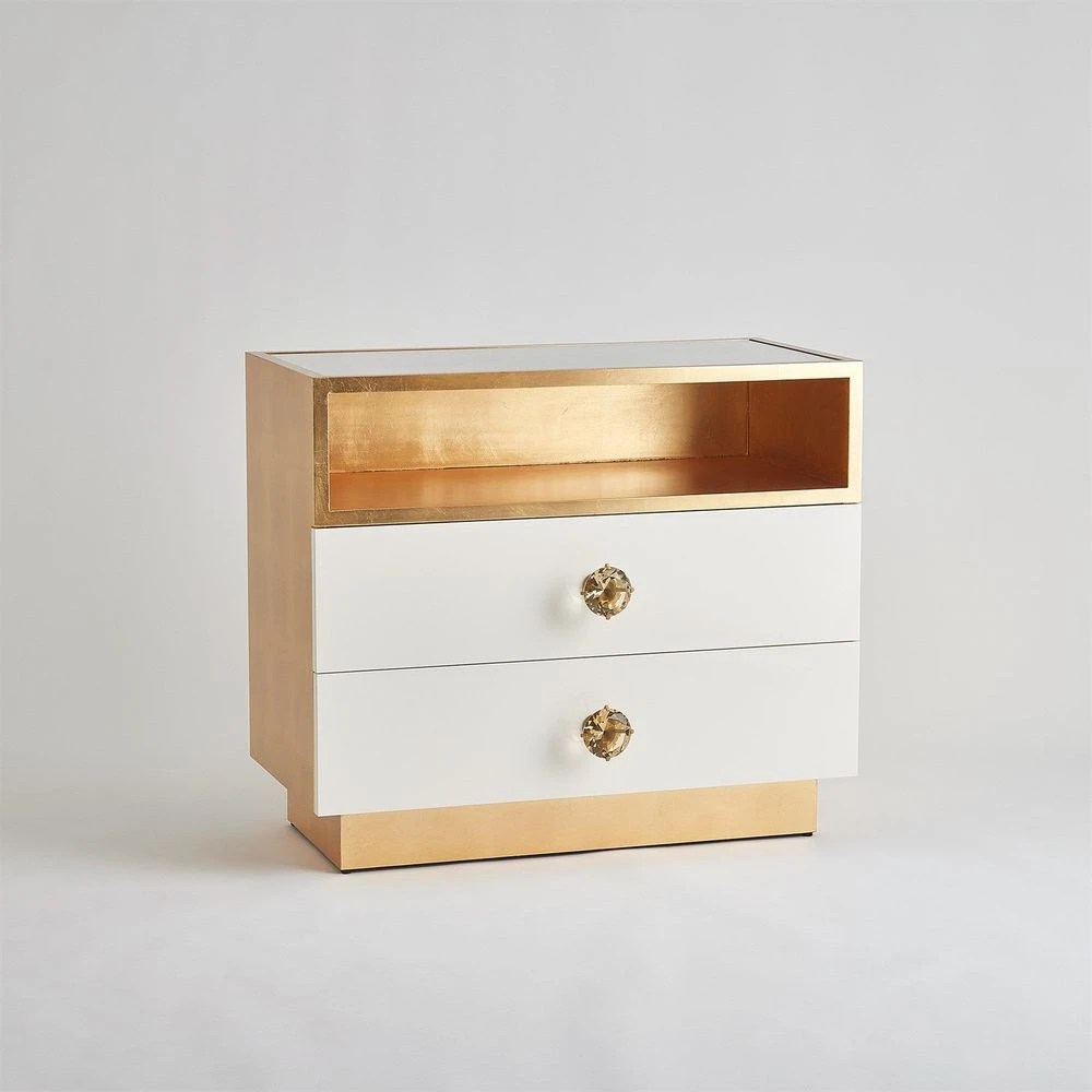 Description: The London Nightstand is cooly elegant and quite high brow. Part of the collection by Julia Buckingham for Global Views, the London Nightstand features the same soft white lacquer drawer front and gold leafed base and sides. The top is inset with glass and the two drawers are adorned with amber crystal pulls.