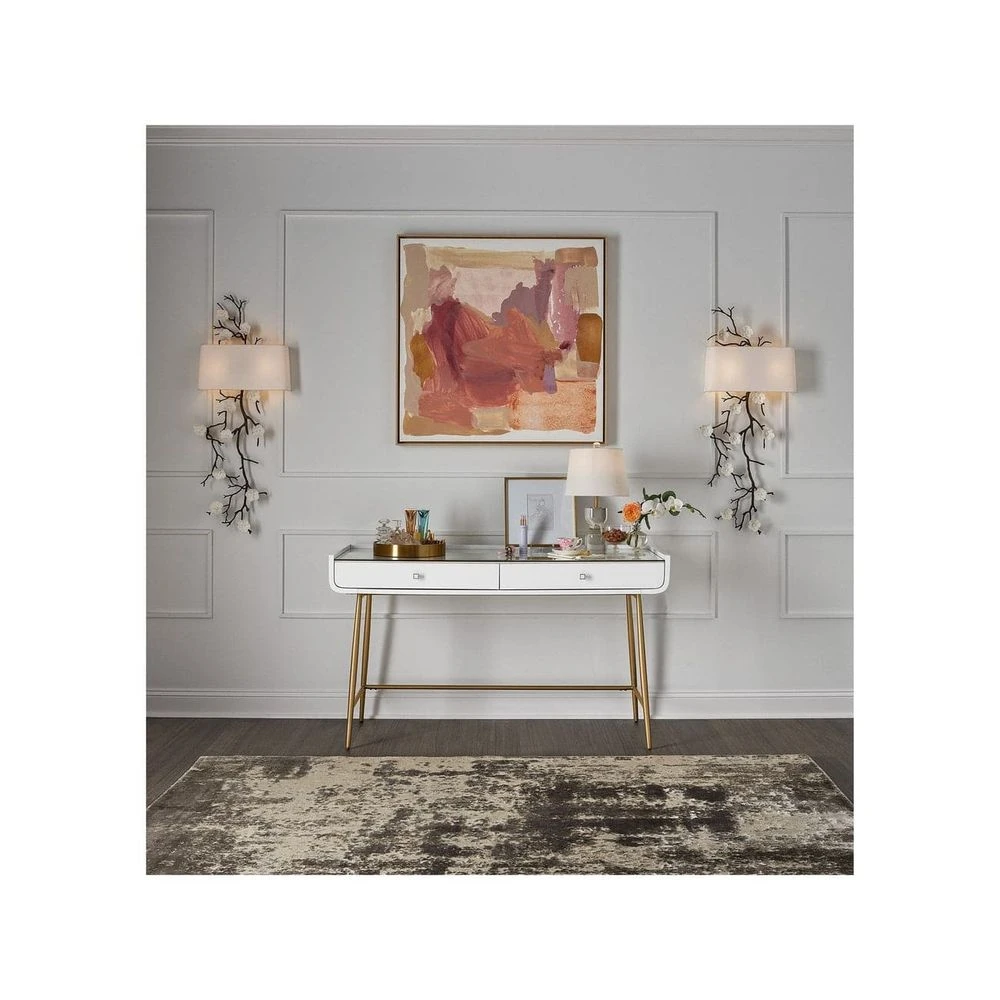 Perfectly suited for a bedroom, home office, and more, the Allure Vanity Desk was designed with every detail in mind. Featuring a glass tabletop inset with faux leather underneath, two drawers with mother of pearl hardware, a soft gold metal base, and a white lacquer finish, this desk embodies refinement.