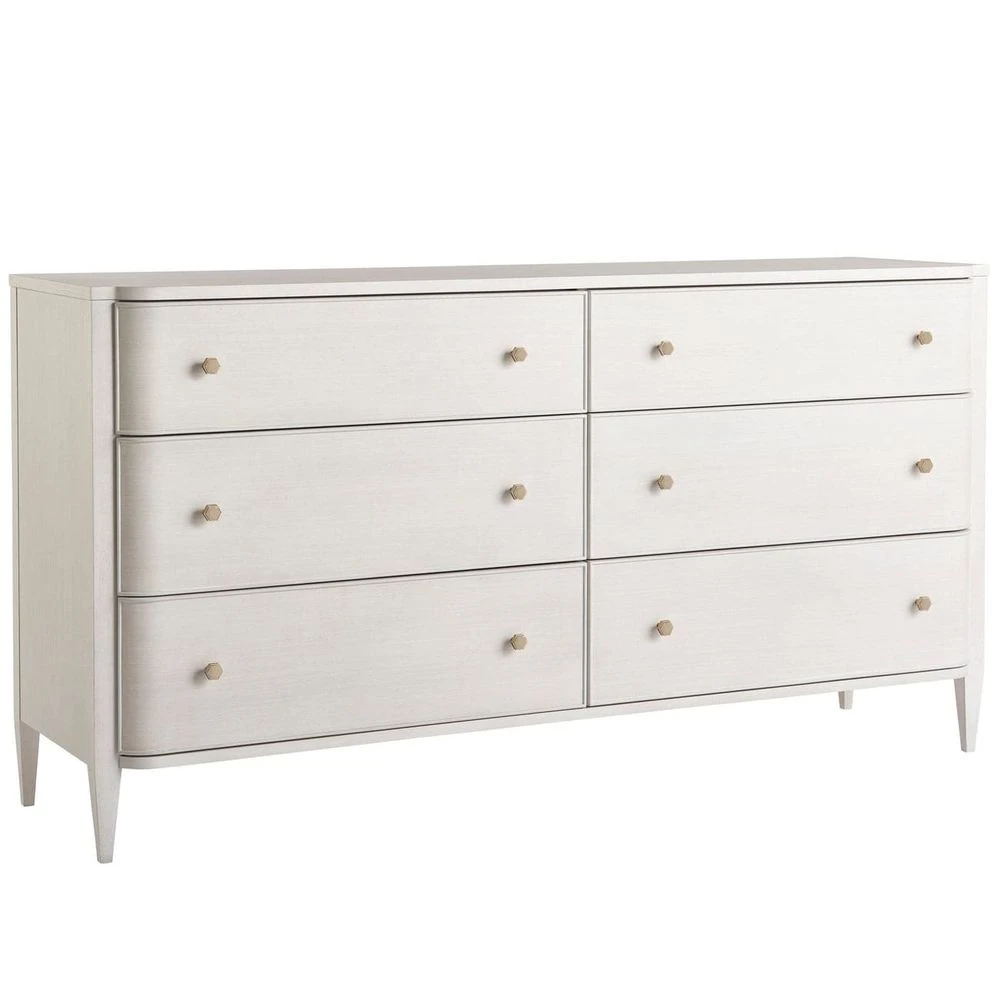 A clean Alabaster finish encases the Chelsea Dresser, which includes six drawers that are accentuated with soft gold, hexagonal hardware for a simple and streamlined look.