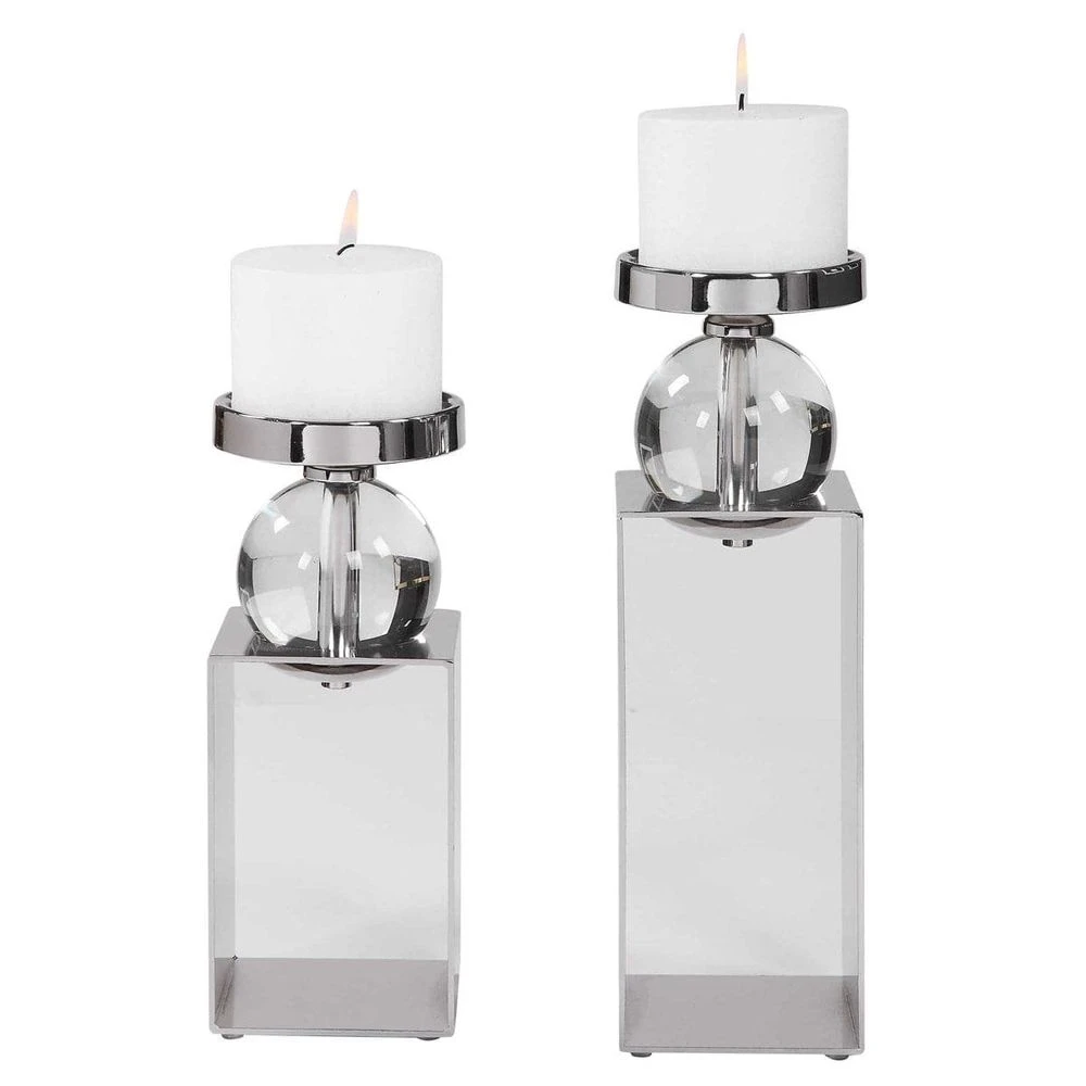Set of two candleholders featuring an open steel frame, finished in polished nickel with crystal accents. Two 4″x 3″ distressed white candles included. Sizes: S-5x12x5, L-5x15x5