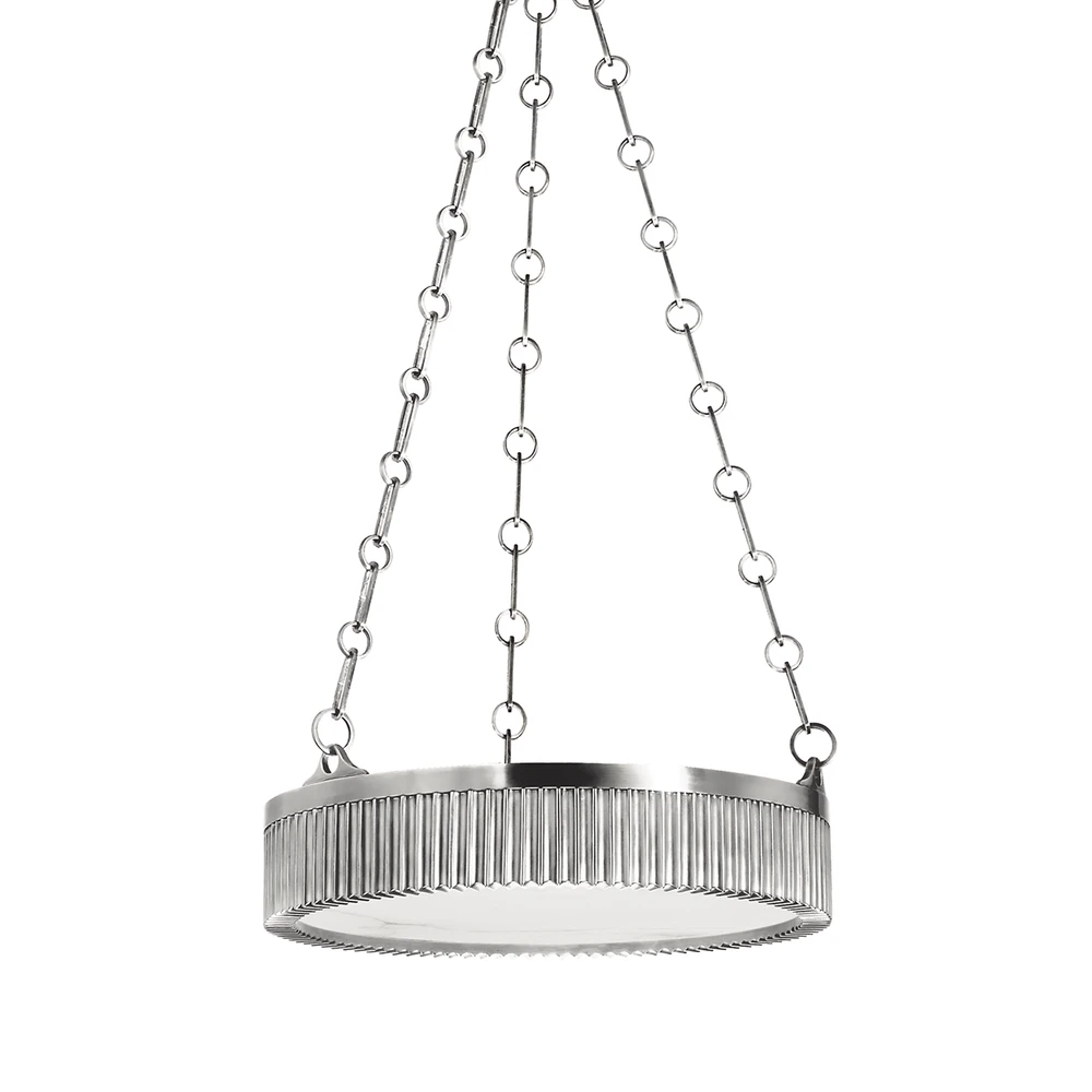 A beautifully detailed, corrugated cast metal frame surrounds the luxurious alabaster diffuser of this stunning drum-shaped pendant. Light passes through the alabaster giving off a soft glow. Available in three sizes and four finishes, Lynden is perfect in entryways, libraries, over large round tables or anywhere you want to make a statement.