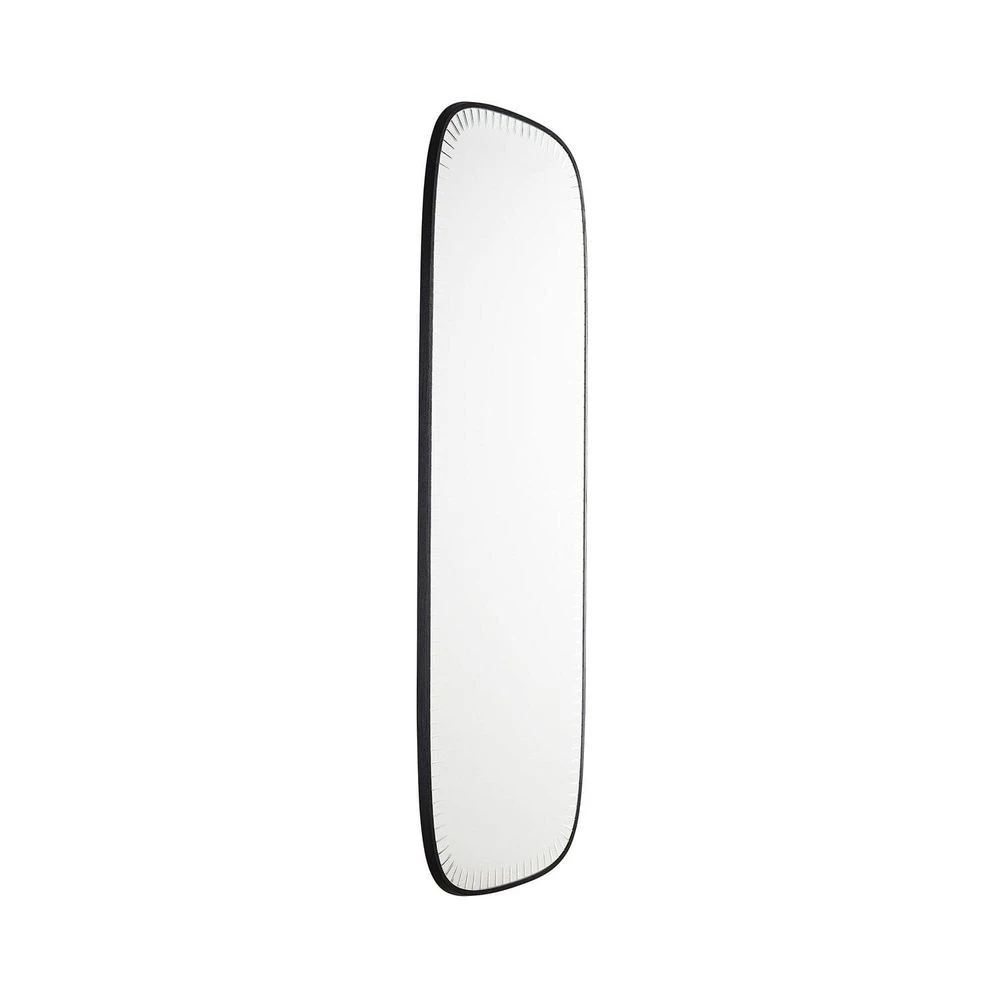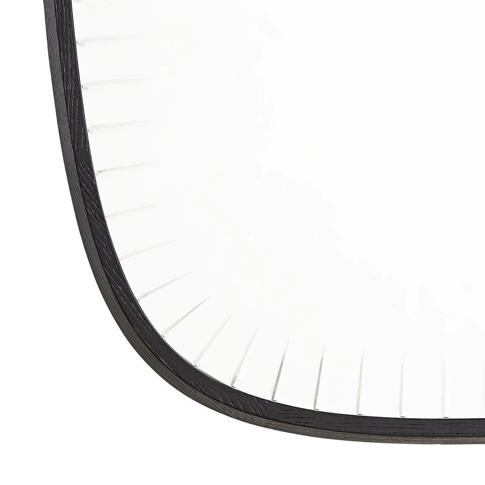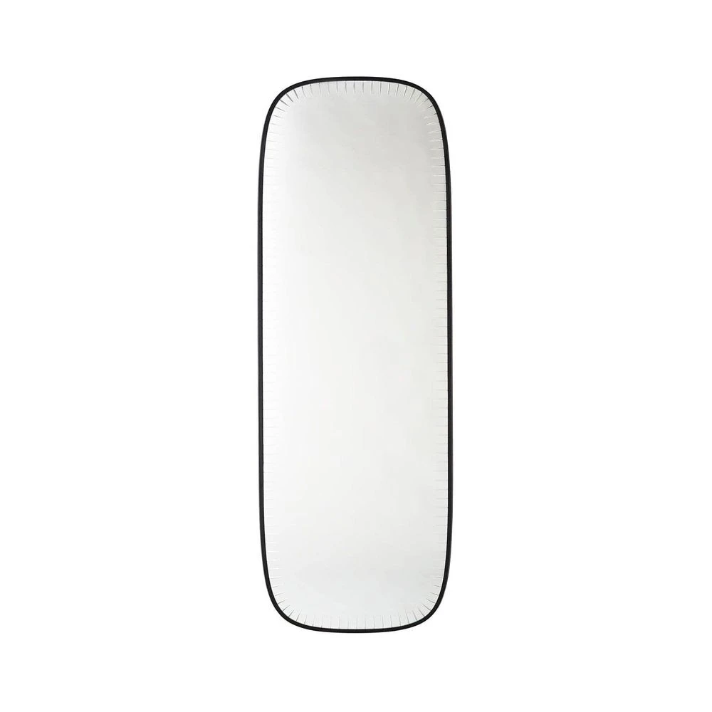 The Stefan tall mirror offers a modern twist on traditional technique, pairing streamlined forms with detailing that brings to mind timeless cut crystal. The full-length wall mirror, featuring an etched gradient slice pattern radiating in from its edge, is set within a sleek black-painted wood frame. Security cleat hanging hardware allows for horizontal or vertical display.