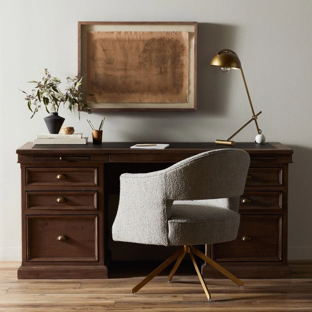 - Description: Borrowing inspiration from the classic lawyer’s desk with an inlaid leather top and French-inspired detailing. Finished in warm, sun-dried wheat tones with cast brass hardware, with dual file drawers for letter-sized documents.