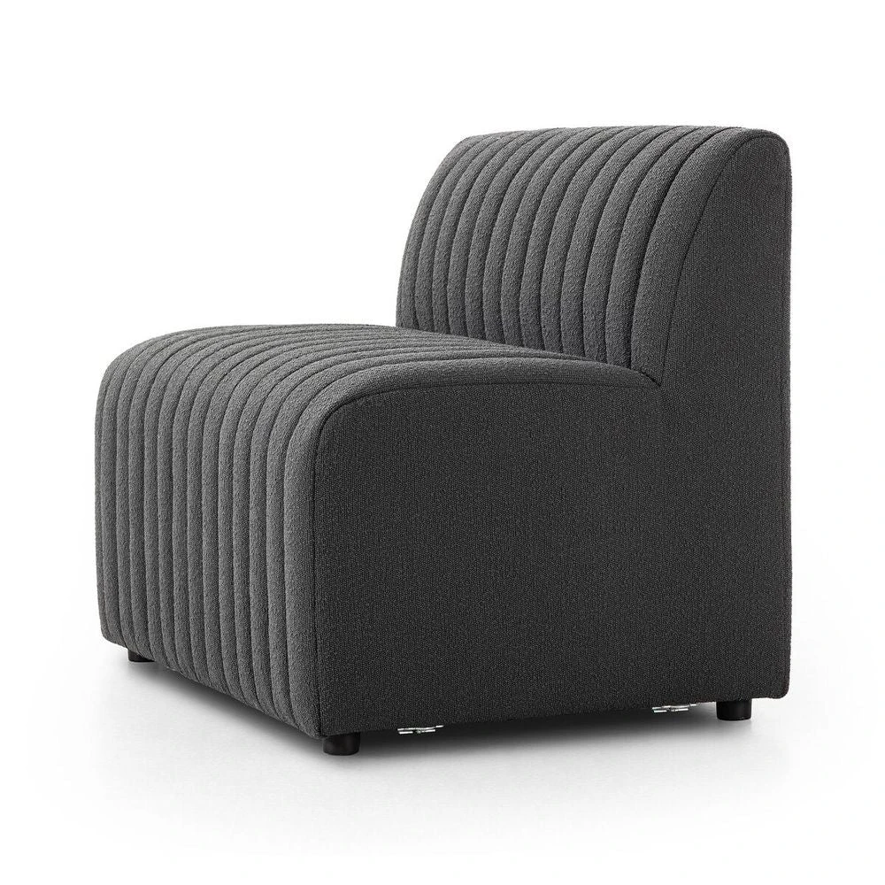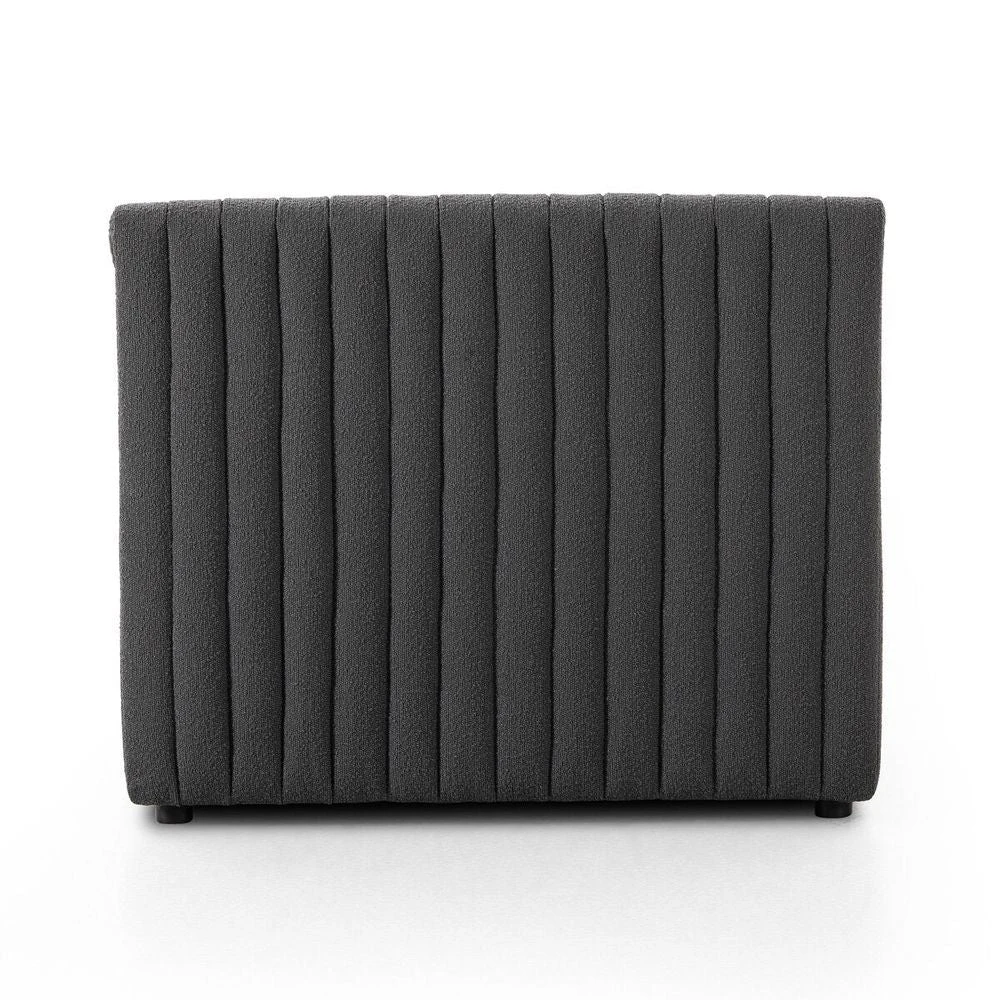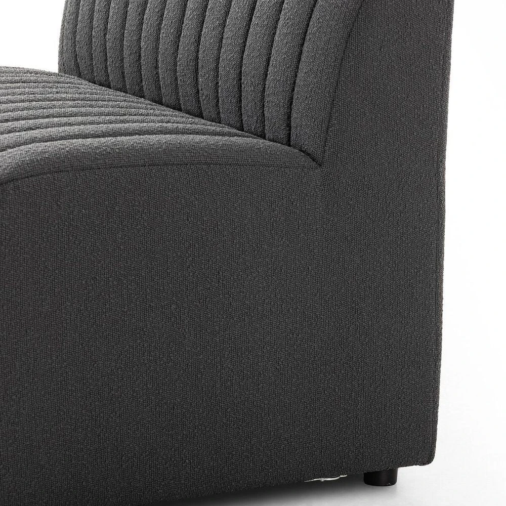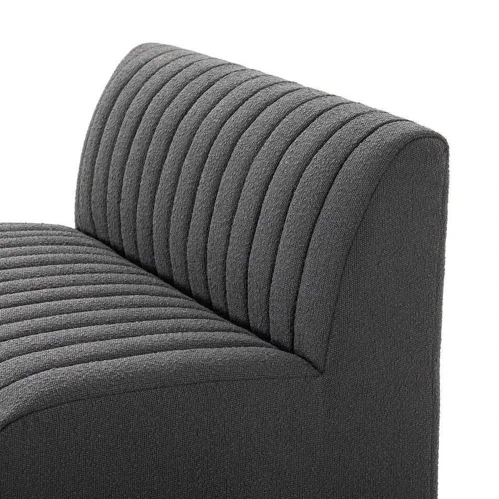 ‘Charcoal high-performance boucle features dramatic channeling for texture and comfort alike. Option to pair with matching pieces for modularity. Easy to clean and made from fully recyclable materials, Fiqa fabrics are machine-washable, stain-resistant, water-repellent and antimicrobial.