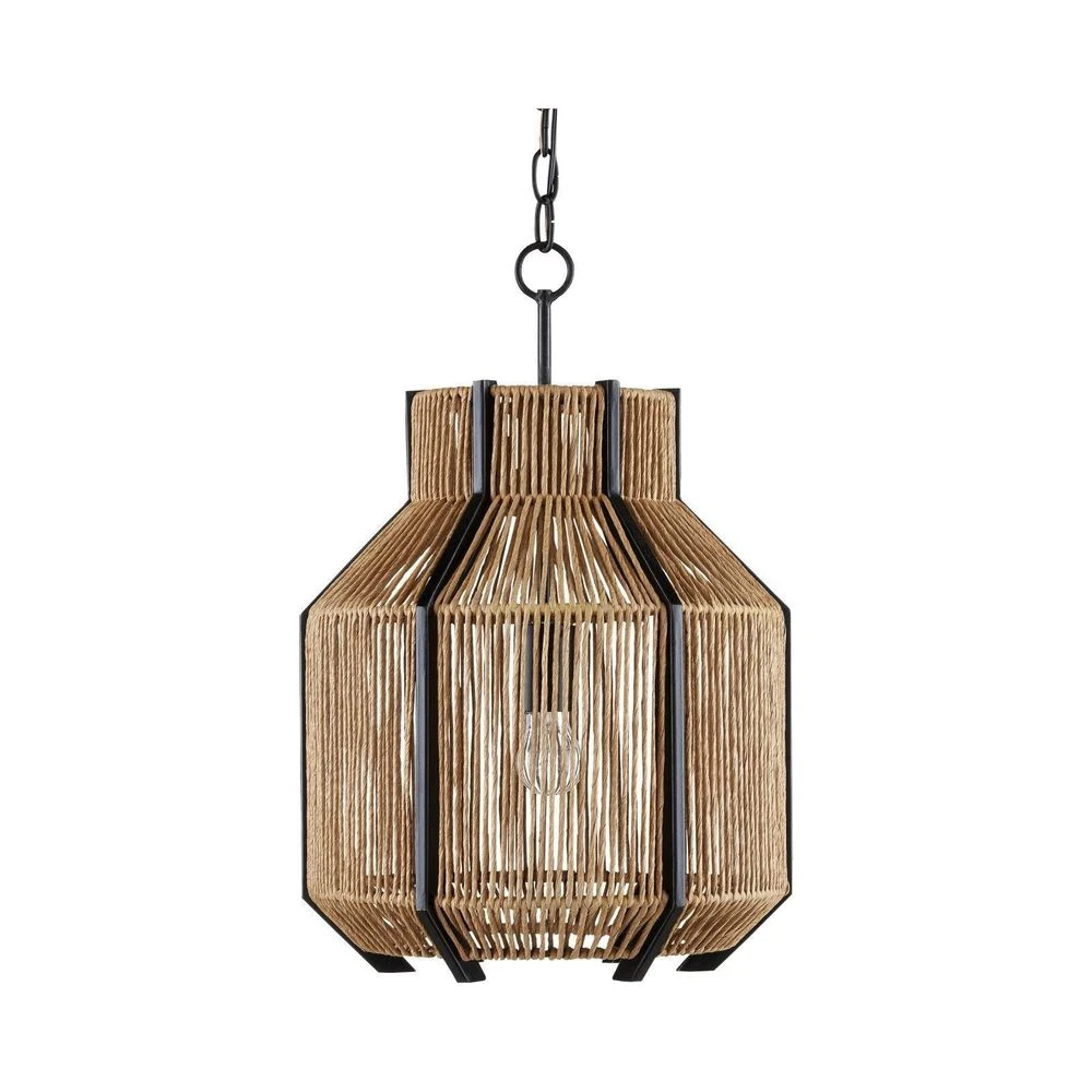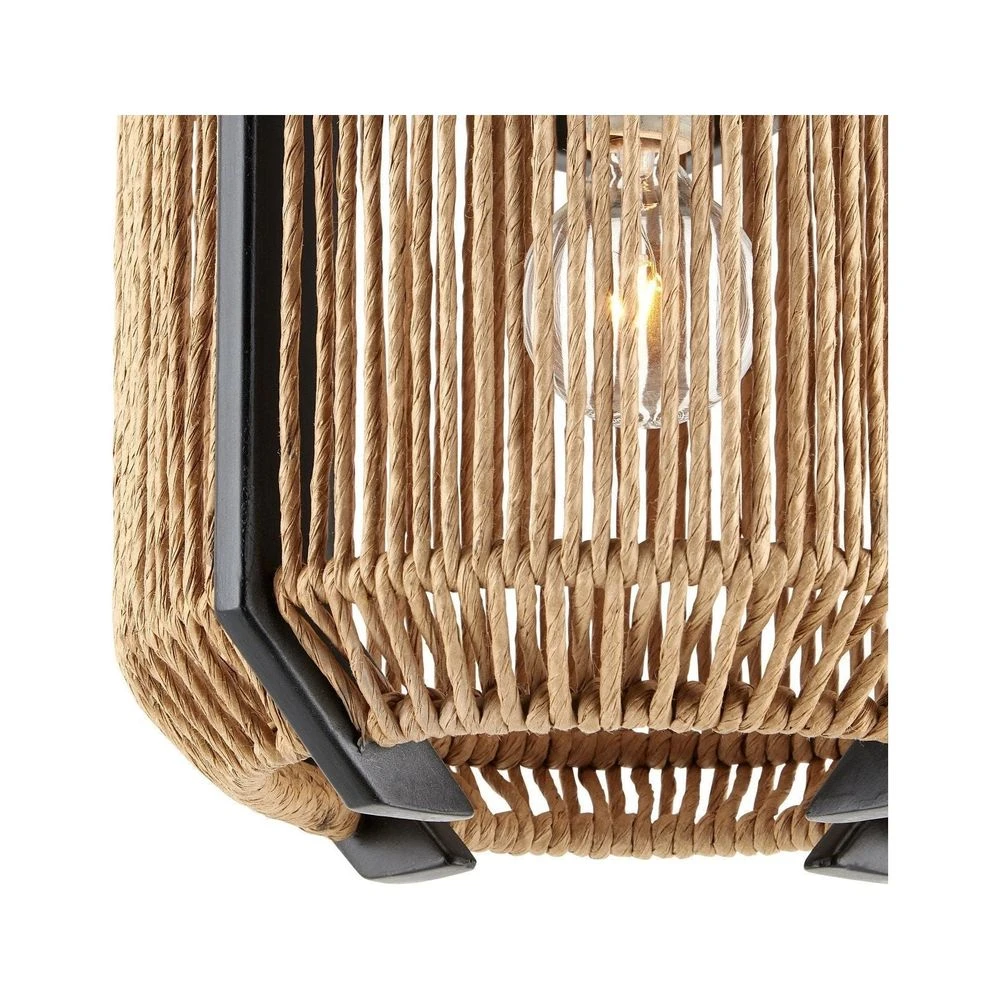 Description: The Mali Pendant, designed by Clarence Mallari, has a complex interplay of sleek and earthy elements. The lines that rise above and below the natural woven shade of the rope pendant are made of wrought iron in a satin black finish, as are the chain from which it is hung and the hardware that holds the bulb. These are the clean-lined elements that contrast the Kraft paper twine, which is tightly woven but not so dense that it interrupts the warm glow of illumination from its interior. Adjustable from 25″ to 93″ with use of included chain/rod kit/cable. If your space calls for a longer drop, additional chain/rods/cable is available for purchase.