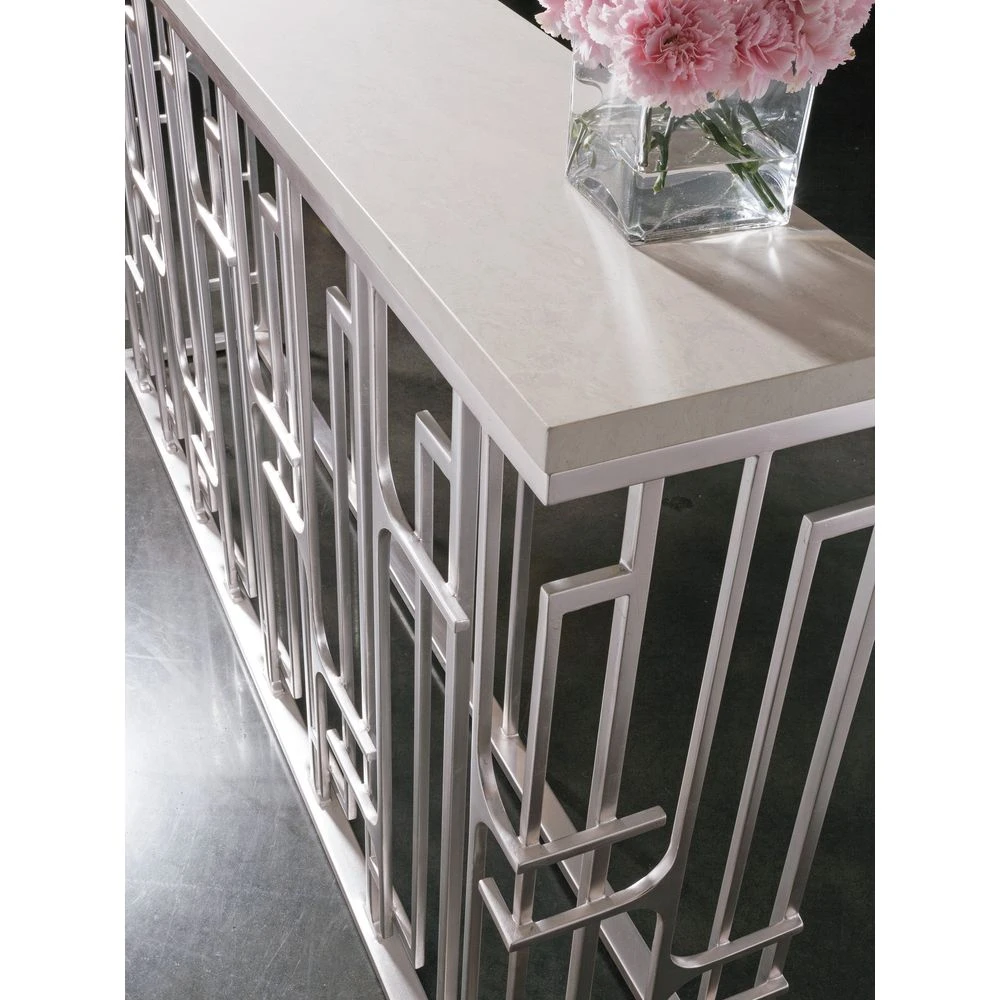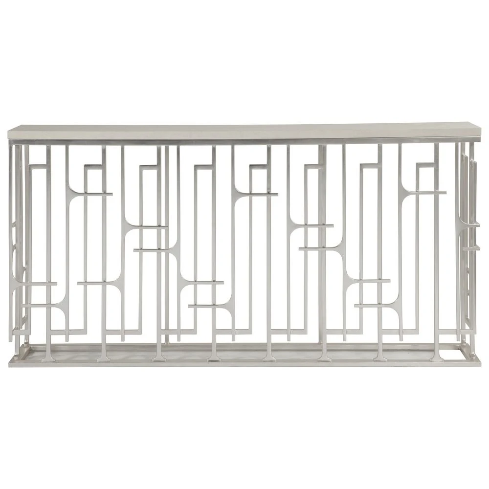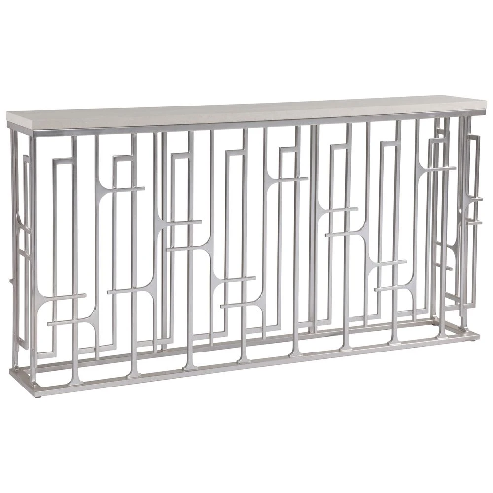 Marketing Copy: Our largest lifestyle collection was conceived to inhabit modern environments in both coastal and mountin settings, featuring original architectural designs dressed in linear quartered white oak veneers in a soft, champagne taupe liimed in an ivory ceruse. Complimentary element include leathered Anticato marble tops, stunning organic hardware in bright nickel, and metalwork clad in a slightly warm silver leaf finish.