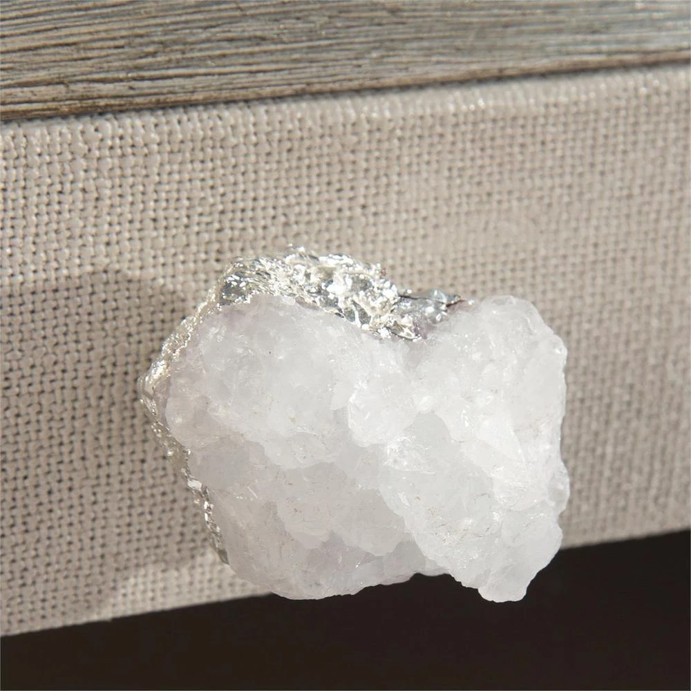 Description: The Valeria Nightstand features a single drawer, storage space, and a pullout slide. The case is inlaid with white linen panels and silver white moldings. The drawer and slide are ornamented with crystal pulls. The interior is finished in antique beluga.