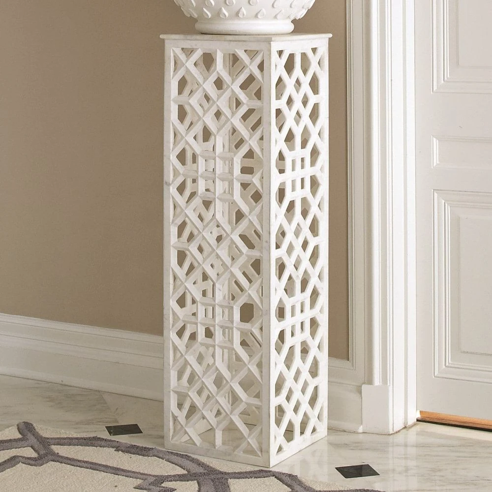 This pedestal is made from hand carved honed white marble from the deserts of India. The fret work pattern is based on traditional Moorish and Indian motifs. This substantial piece is an incredible value for the materials and hand work in it.
