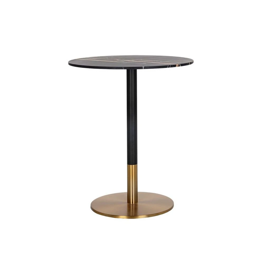 A round bar table from our Ikon collection inspired by Art Deco luxury. Features a matte black marble top with striking gold and white veining and a black and gold steel base. Perfect for small kitchen and dining spaces. As marble is a natural material, unique veining, pitting, fissures, micro-cracks and colour variations are all characteristics that add to the uniqueness and beauty of each piece.