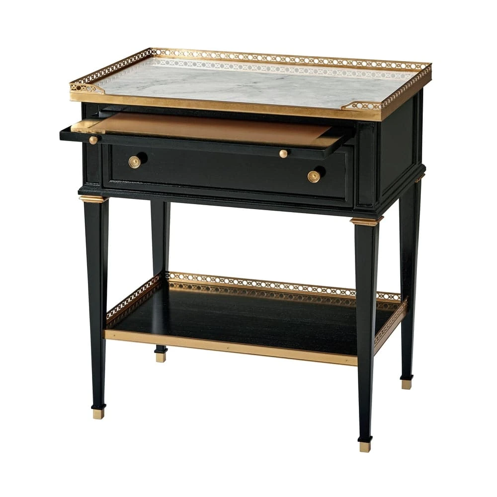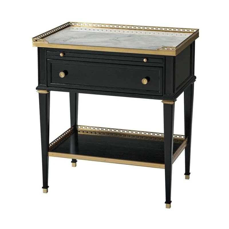 This French neoclassical nightstand is based on an antique in Alexa Hampton’s own home. Cherished details abound: pierced brass gallery with Bianco Carrara marble top, pullout tray, single drawer with cast brass handles, tapered legs with brass capitals and feet, and pierced brass gallery lower shelf. Perfect as an end table too!