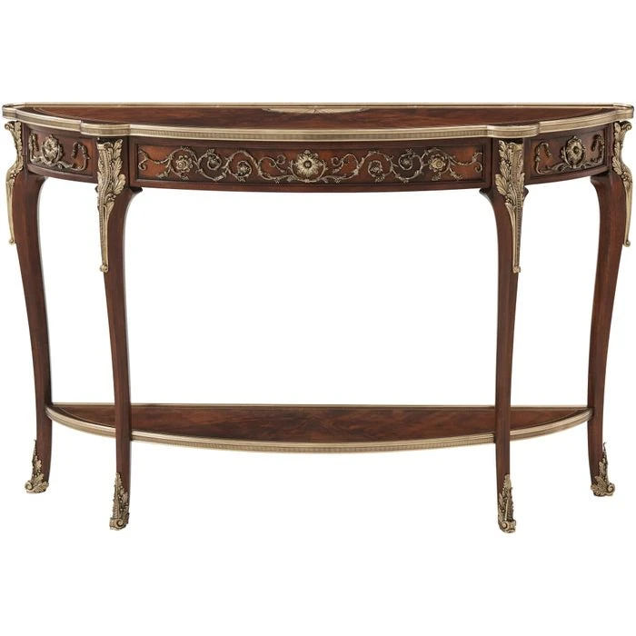 A fine flame mahogany and Morado banded console table with fan marquetry, brass line and mother of pearl inlays, the bowfront Old English brass bound top with lobed corners. Theodore Alexander is shaped by English Heritage handcrafts furniture and accessories for your home with uncompromising quality. They also believe that the person who owns a piece of Theodore Alexander Furniture should take comfort in knowing the item can be viewed from any side and they have made the piece by using a time-honored, handcrafted method that is the true mark of high quality. Every piece of Theodore Alexander has a story just waiting to be shared.