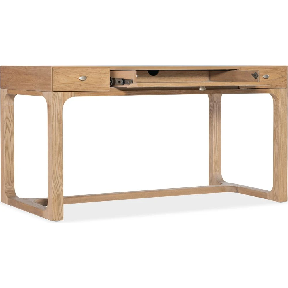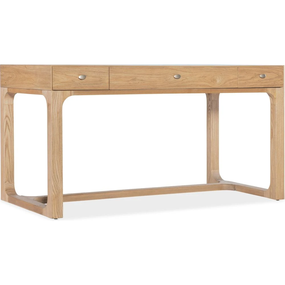 Description: A sleek silhouette combines with an organic light natural pecan finish over Pecan Veneers to create a simple chic design. The Memoir Desk has 3 drawers. The center drawer has a drop-front for keyboard use and the left and right drawers have removable dividers and a writing slide and drawer organizer that can be used in either drawer. Pewter oval knobs add a finishing touch.