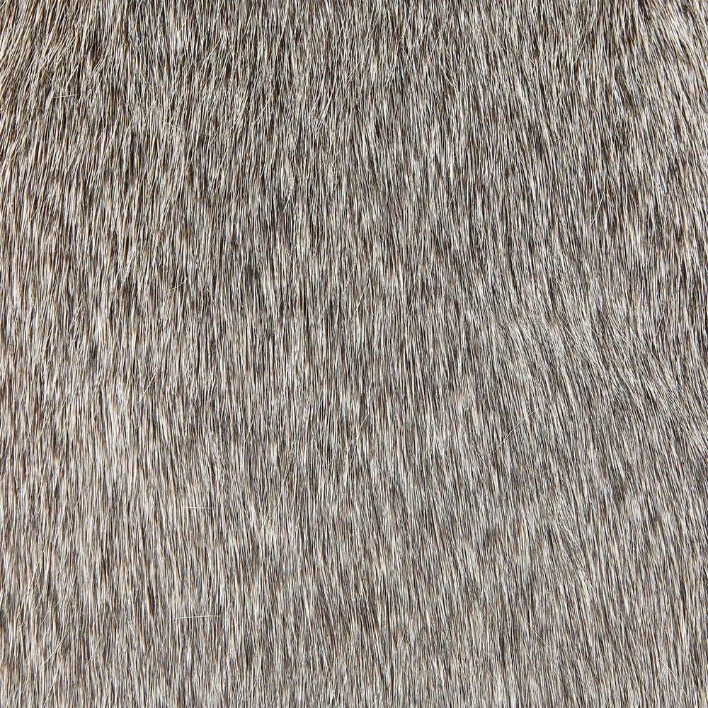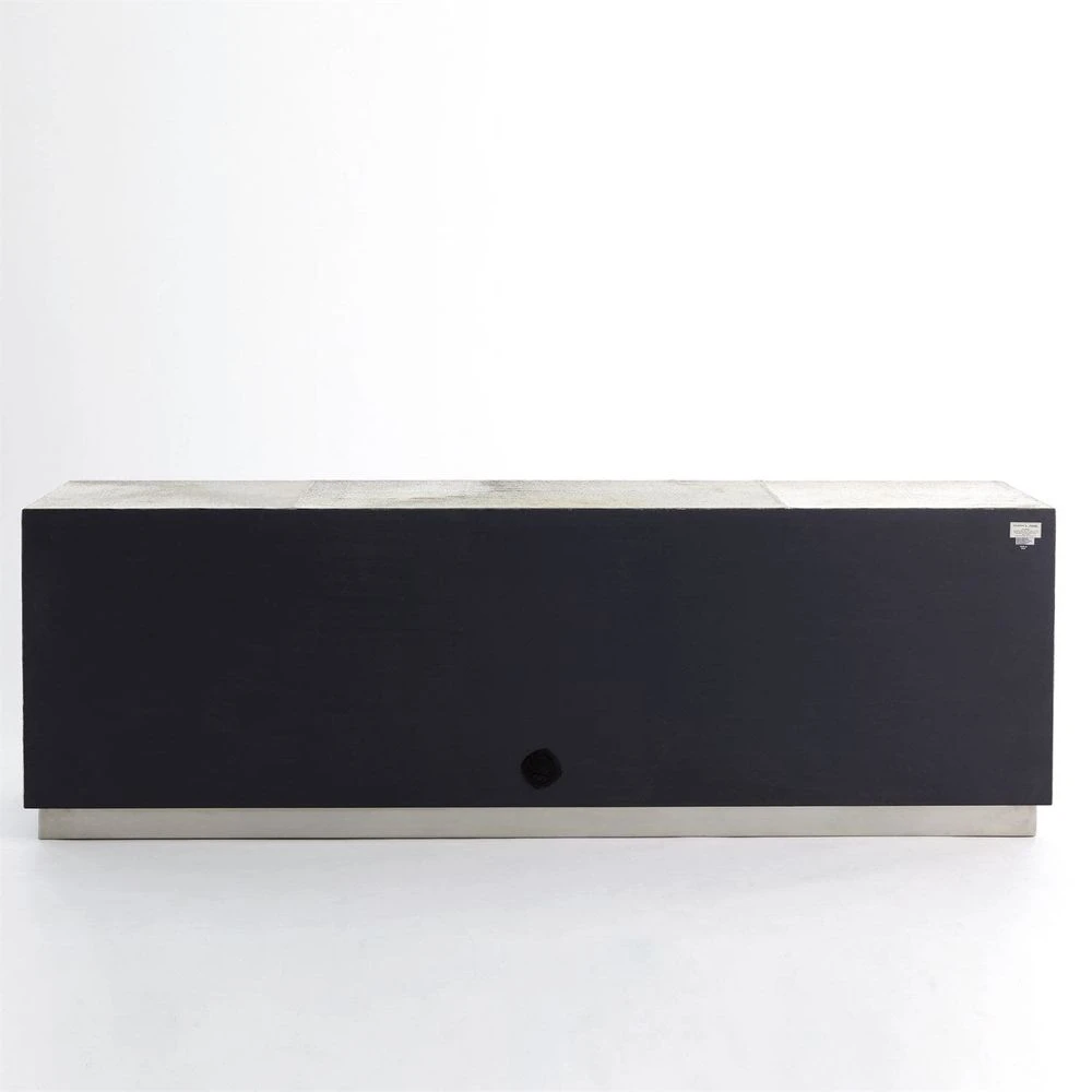 The stunning Metro Long Cabinet earns its name with distinctive grey hair-on hide on each of its six drawer fronts, two doors and cabinet sides. A sleek plinth base in a satin nickel finish grounds the piece beautifully, while a velvety poly-suede lined interior adds a perfectly polished finishing touch. Behind the center doors is a single shelf. Three drawers flank each side of the doors with a black grommet for easy media access. Hardware are cast from an antique