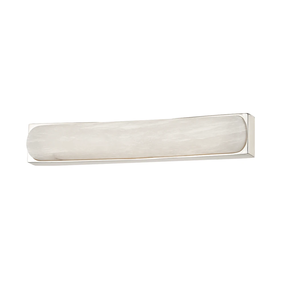 Thoroughly modern, Millie is clean and simple. A luxurious piece of Spanish alabaster is set within a subtlety waxing and waning frame of vintage brass or burnished nickel. While the alabaster is gorgeous unlit, it comes to life when lit, filling the fixture, and the room, with a warm, inviting glow.