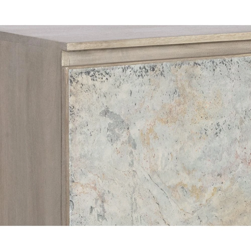 Rich with texture, this unique sideboard illustrates the beauty of mixed materials coming together in harmony. Features a grey solid mango wood frame with slate veneer on the door fronts. Completed with stainless steel legs in a brass finish. Made in India: with refined craftsmanship, this design was brought to life by skilled local artisans. By nature, these materials develop unique imperfections such as fissures, markings and colour variations for a truly one-of-a-kind piece.