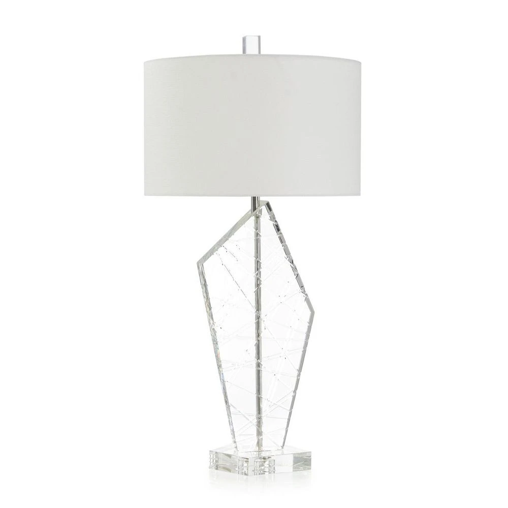 Description: The Solis Table Lamp features a gorgeous, asymmetric body of crystal that showcases sharp angles and artistic striations that elevate the piece into a textural marvel. The lamp rests gently on a square crystal base with a crystal final adorning the top, making the piece almost completely transparent. A neck of iron with a polished nickel finish provides playful contrast and adds a touch of modernity to this beautiful statement piece.
