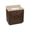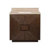Description: The deep-toned distressed cocoa finish on the Morombe 36″ Cocoa Vanity highlights the patterns of natural wood that form embedded squares in a geometric illusion of depth. The interior has one adjustable shelf and there are two optional wood trays that attach to the inside of the doors. The travertine top is fitted with a rectangular undermount sink. Other fine design attributes include soft-close door hinges and a matching marble backsplash.
