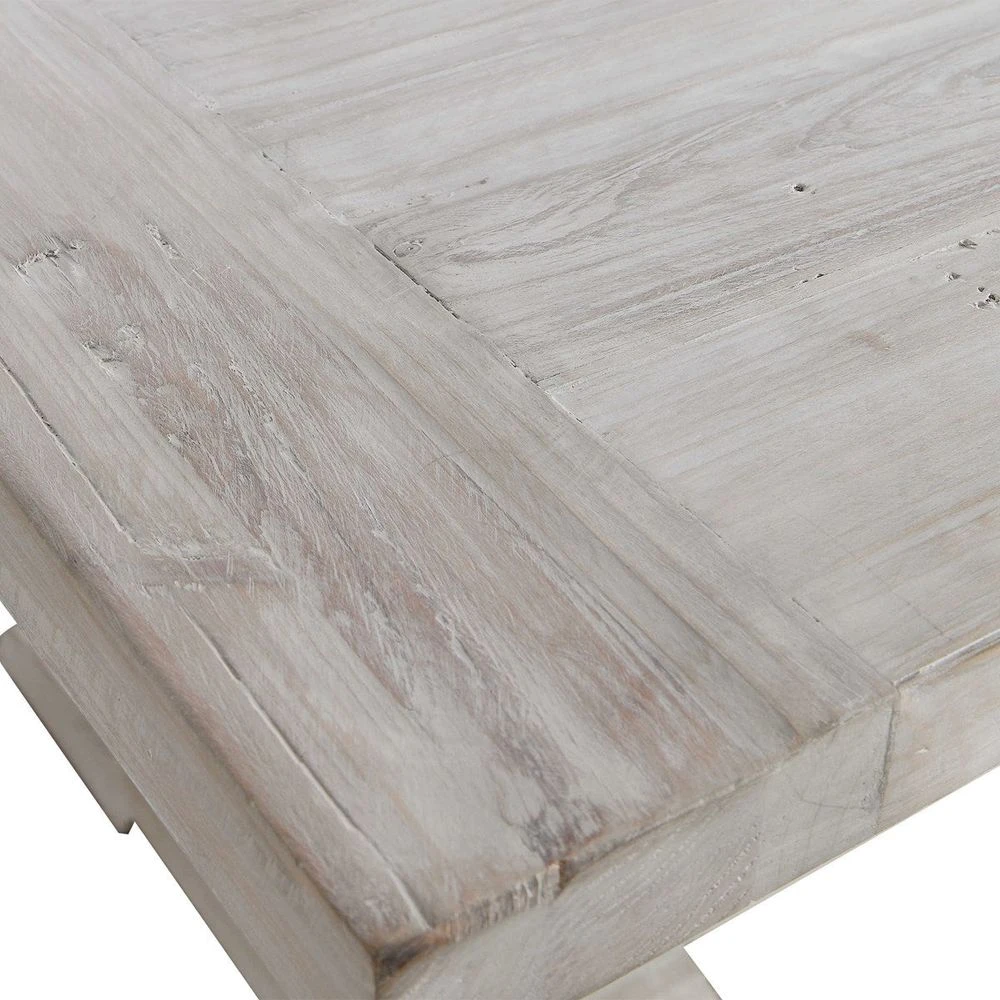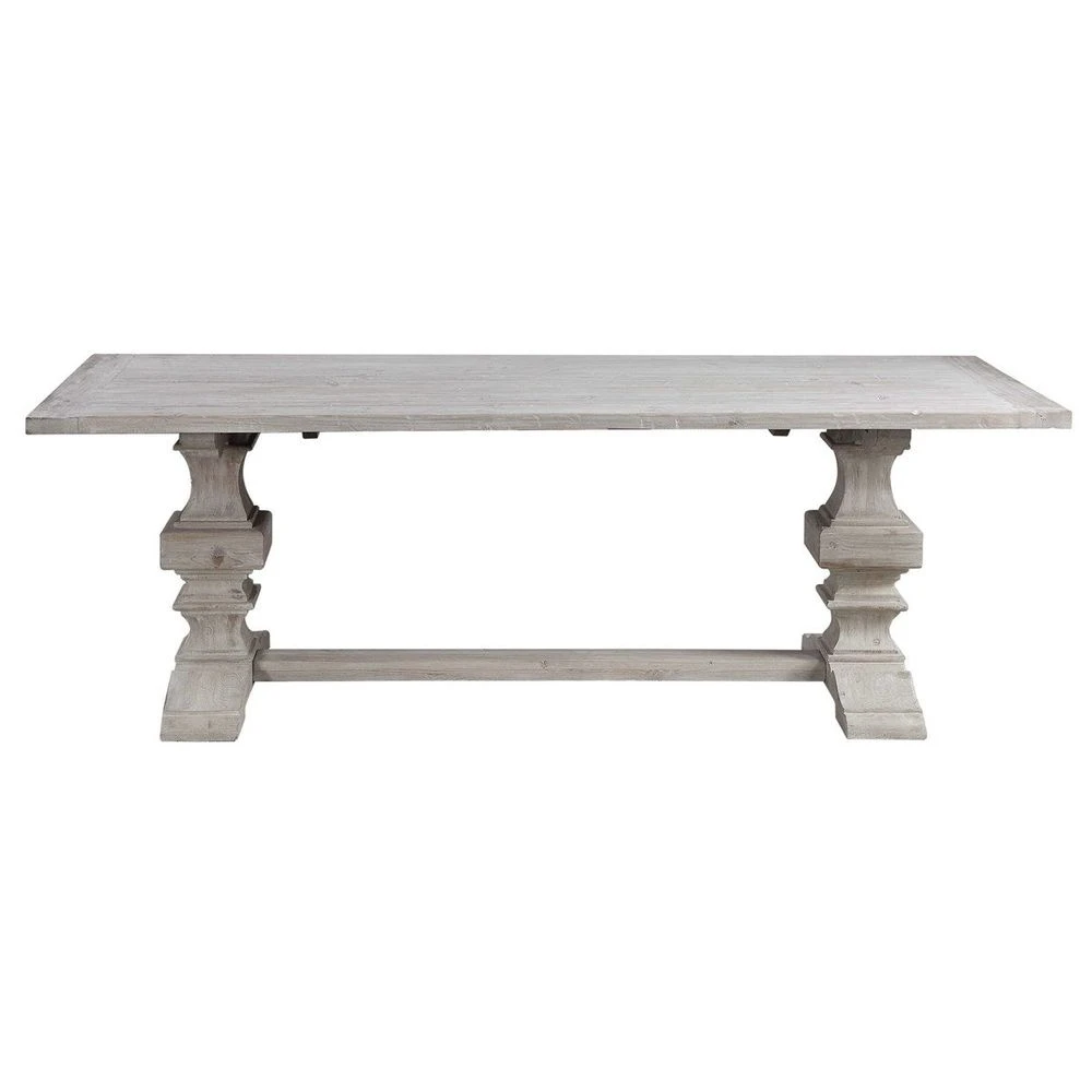 Made of 100% recycled pine, this grand farmhouse table features a slatted top finished with breadboard ends, atop carved balusters, distressed and rubbed with a subtle off white wash resting in the cracks and natural recesses. Includes two 18 inch leaves that can be removed to create a 96″ table. Solid wood will continue to move with temperature and humidity changes, which can result in small cracks and uneven surfaces, adding to its authenticity and character.